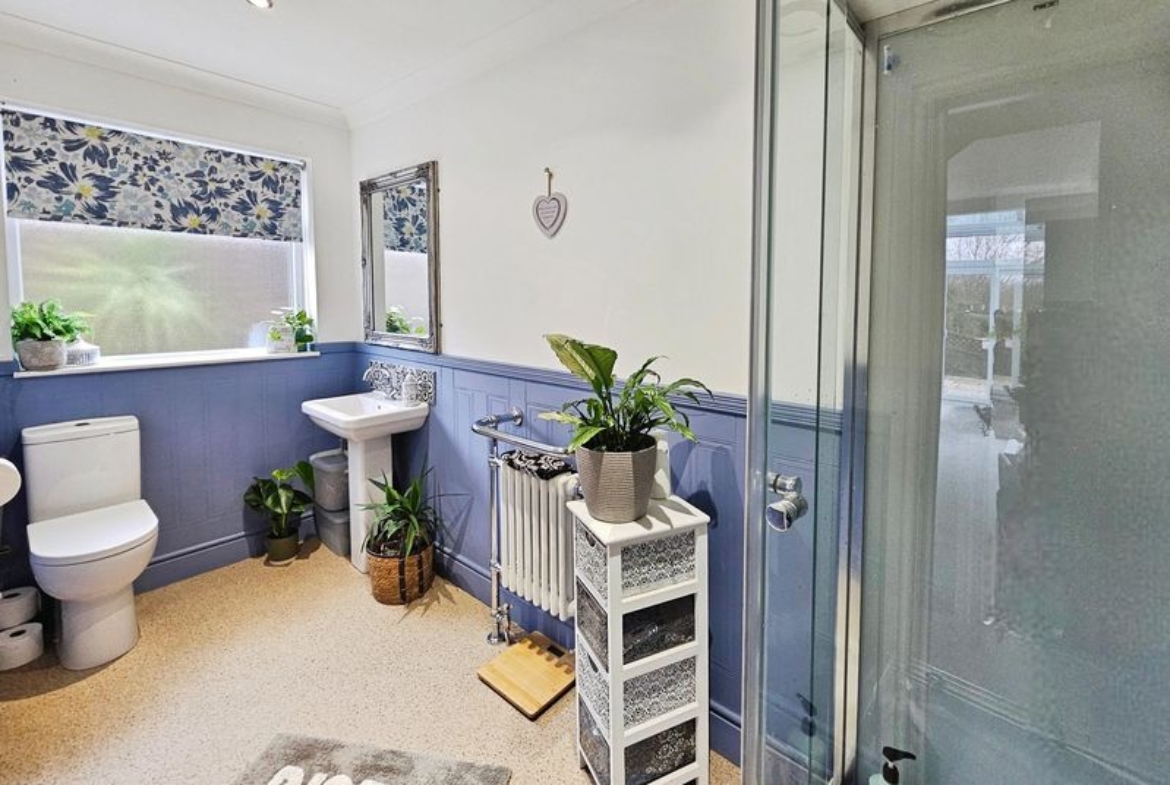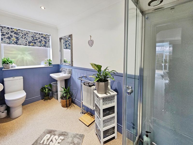 Double glazed window to side, high level wc, feature radiator, shower cubicle (digital electric shower), spotlight, vinyl flooring.