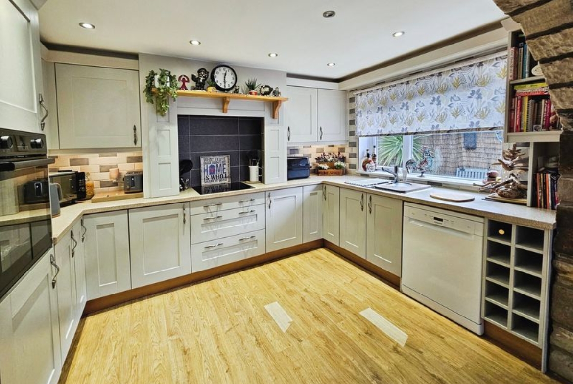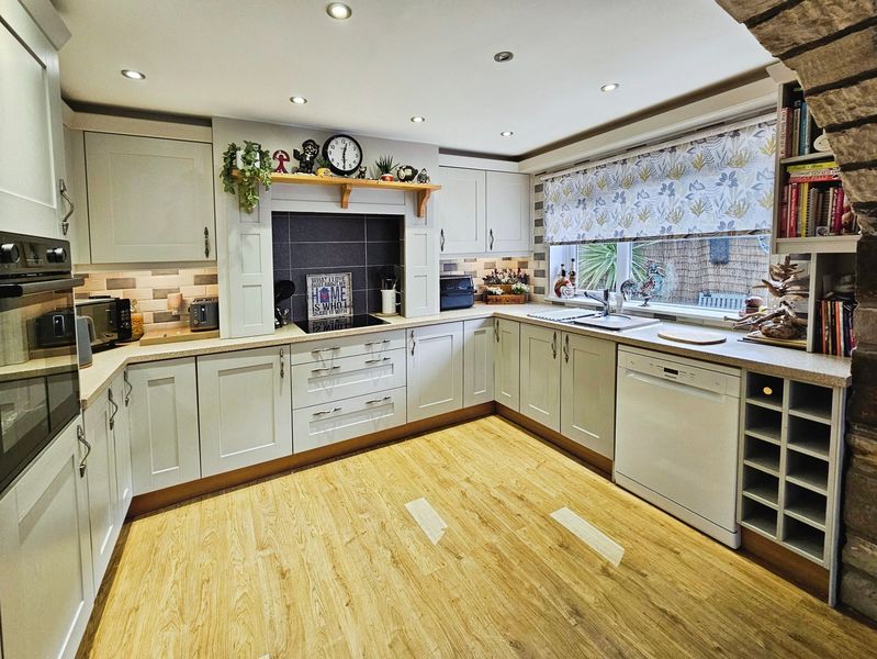 Double glazed windows to front and side, double radiator, fitted with range of wall, floor and drawer units with coordinating roll edge work surfaces, stainless steel sink unit and drainer with mixer tap, tiled splash backs, built in electric fan assisted oven, electric hob with extractor fan above, space for fridge, plumbed for dishwasher, laminate flooring, spotlights.