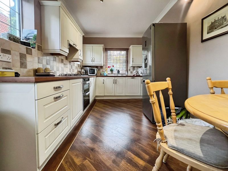 The kitchen is well-appointed with ample natural light, a designated dining space, and access to a utility room, providing both practicality and comfort for daily living.