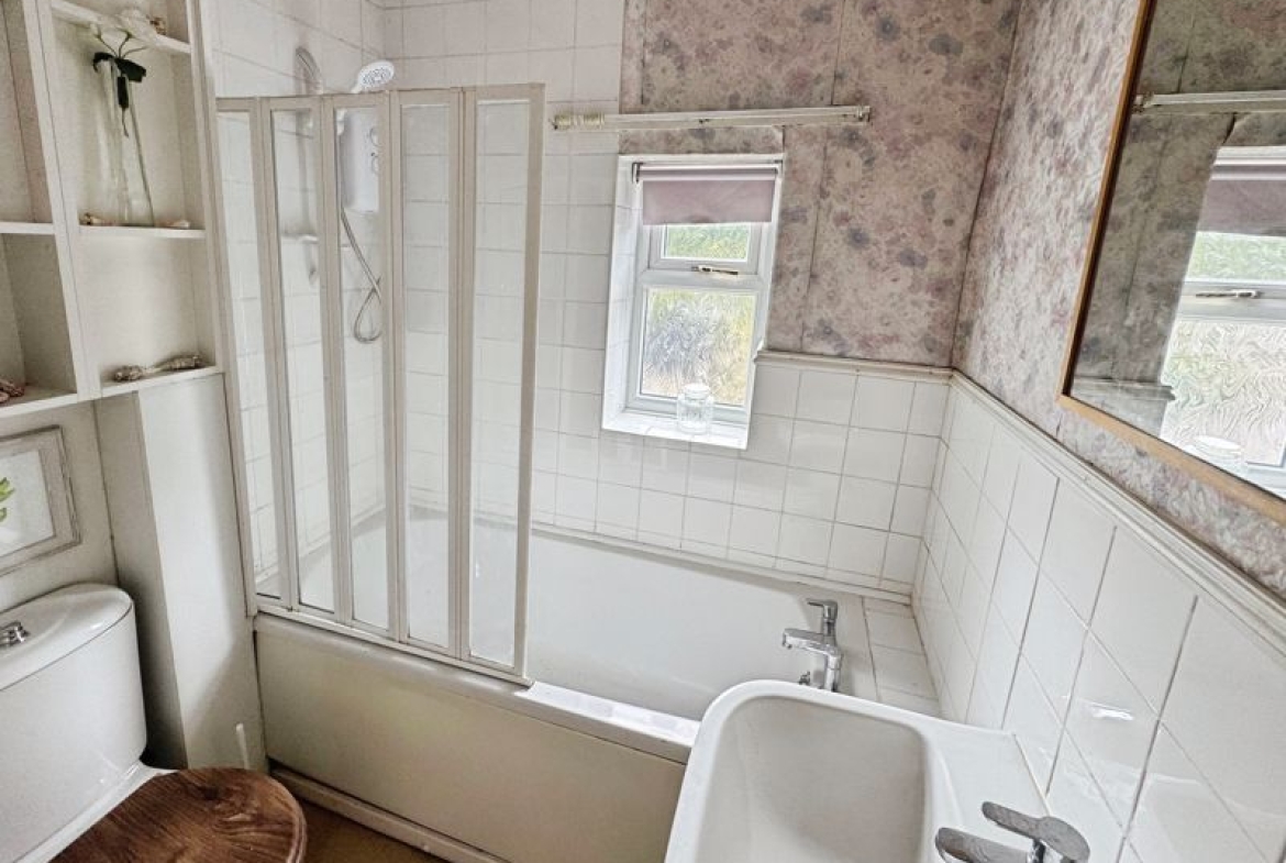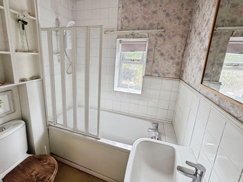 UPVC window, bath with shower, low level wc, wash hand basin, part tiled and radiator.