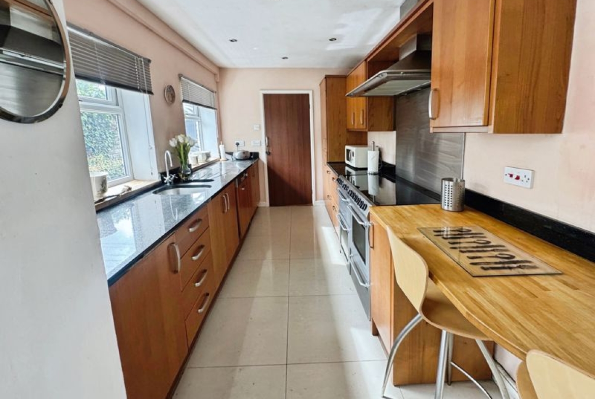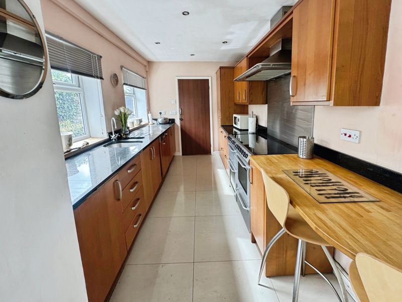 UPVC door to the rear, UPVC window, fitted with a range of matching wall and base units with work surfaces above incorporating one and a half bowl sink unit with drainer, Range style cooker, integrated dishwasher, fridge freeer and breakfast bar.