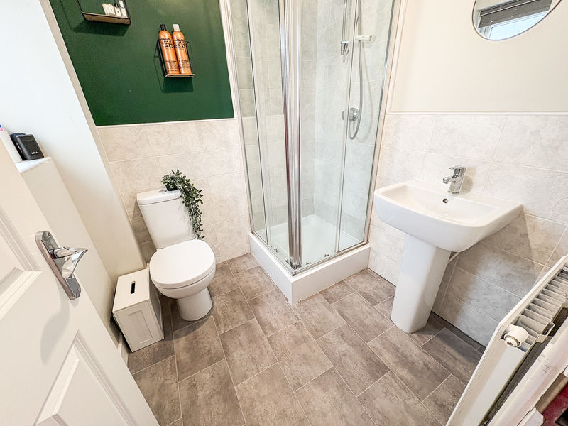 EN-SUITE SHOWER ROOM: double glazed window to front, low level w.c, pedestal wash hand basin, shower cubicle and part tiling to walls.