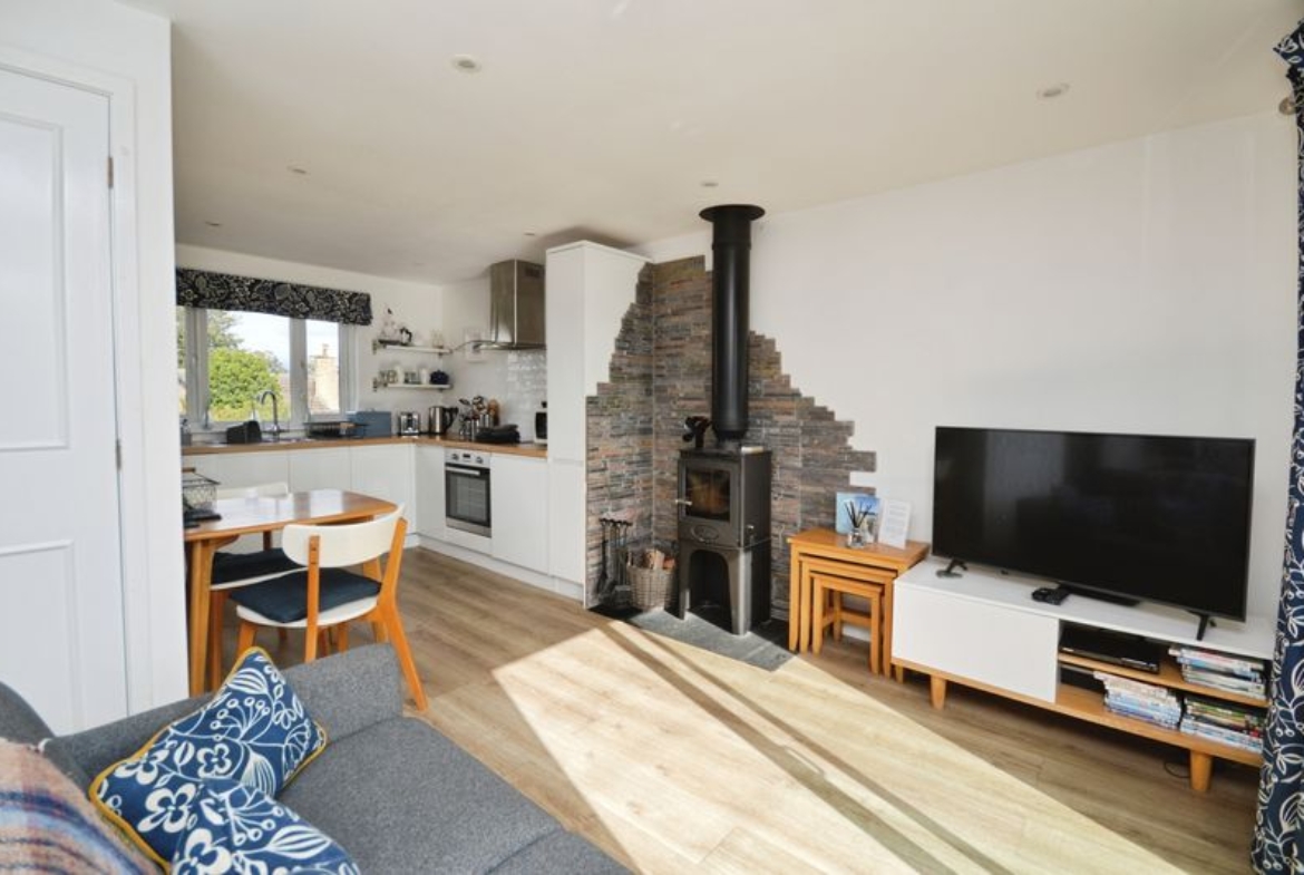 UPVC double-glazed windows to front & rear | Double-glazed sliding patio doors to south facing veranda | Wood-burning stove | Fitted units comprising; Electric induction hob & oven with extractor hood, integrated fridge with small freezer box, integrated washing machine, integrated dishwasher | Tall narrow pull-out larder cupboard | Open shelves providing additional storage in kitchen area | Downlights | Rointe Wifi enabled electric radiator | Panelled headboard wall | Loft access hatch | Wardrobe with shelf & hanging rail | En-suite comprising; tiled shower cubicle with electric shower and glass door, close-coupled W.C, cabinet with integrated wash-basin, mirror with lighting operated by touch control, chrome ladder-style radiator, Downlights, extractor fan, UPVC double-glazed frosted window