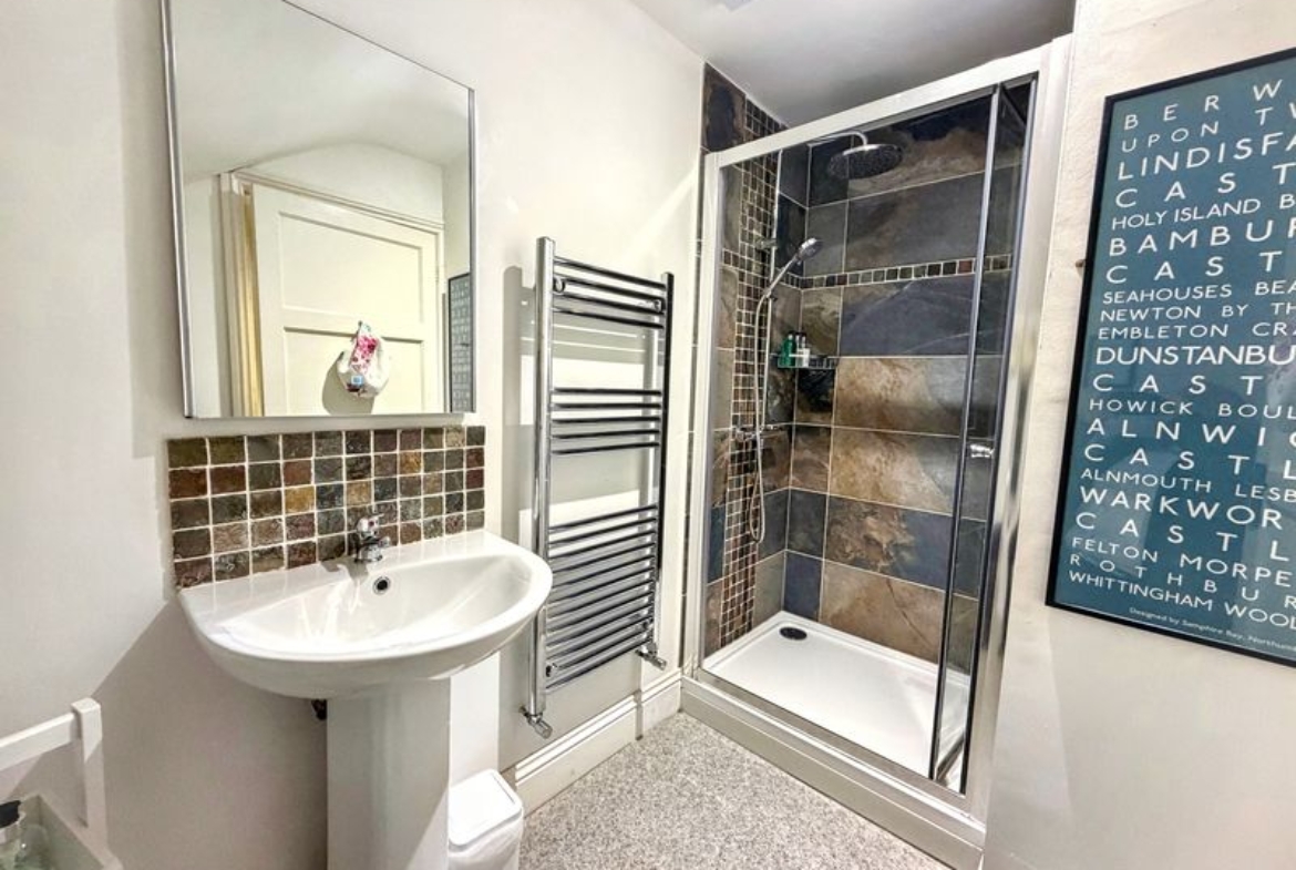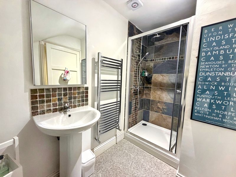 Tiled shower cubicle with bi-fold glass door, mains rainfall-head shower plus separate hand-held attachment | Close-coupled W.C. | Pedestal wash-hand basin | Chrome ladder-style radiator | UPVC double-glazed frosted window | Extractor fan | Mirror with lighting operated by touch control