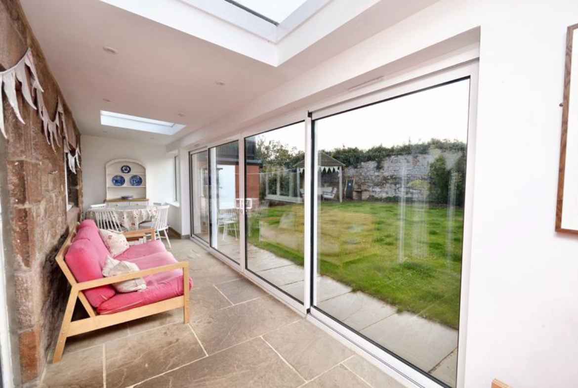 Double-glazed sliding door windows to garden | Stone flagged floor | Ceiling downlights | Double-glazed roof windows