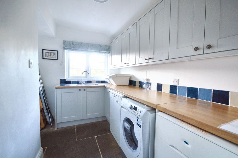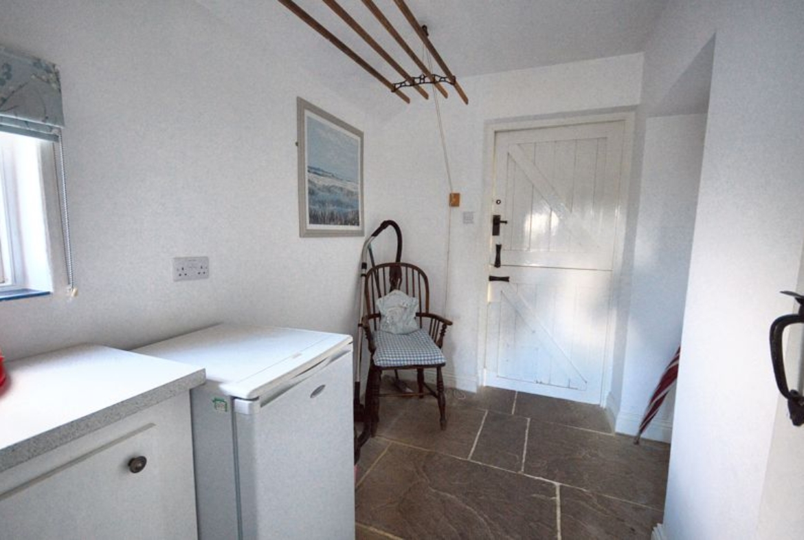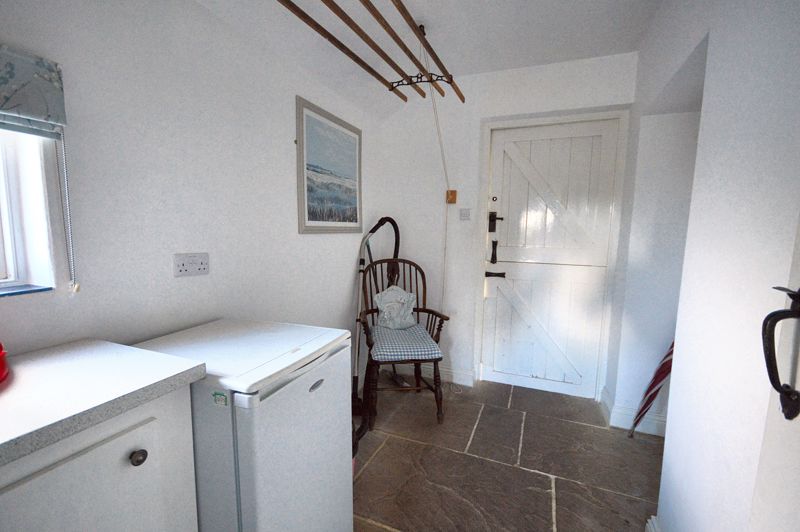 Stone flagged floor | Frosted-glass window | External stable door to garden | Fitted base cupboard housing boiler expansion vessel | Space for a fridge-freezer