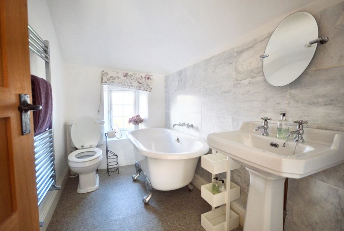 Free-standing roll-top bath | Close-coupled W.C. | Pedestal wash-hand basin | Chrome ladder-style radiator | Part-tiled walls | UPVC double-glazed frosted window to front | Extractor | Downlight & wall light