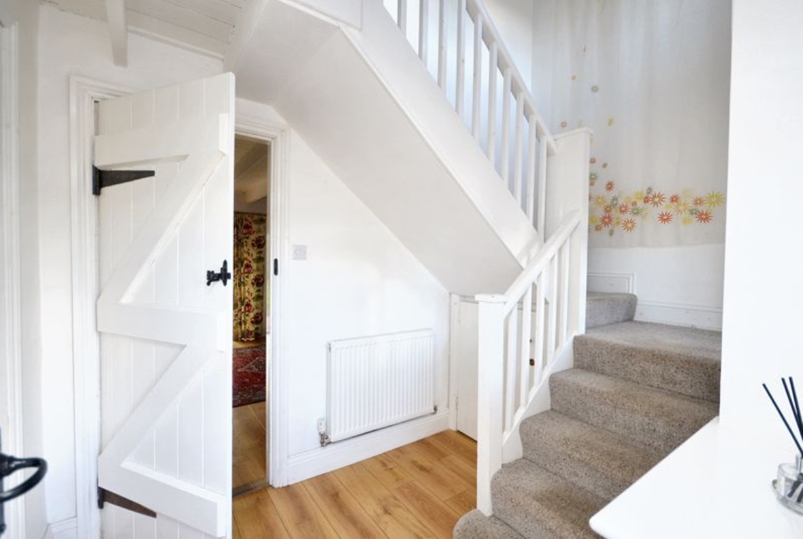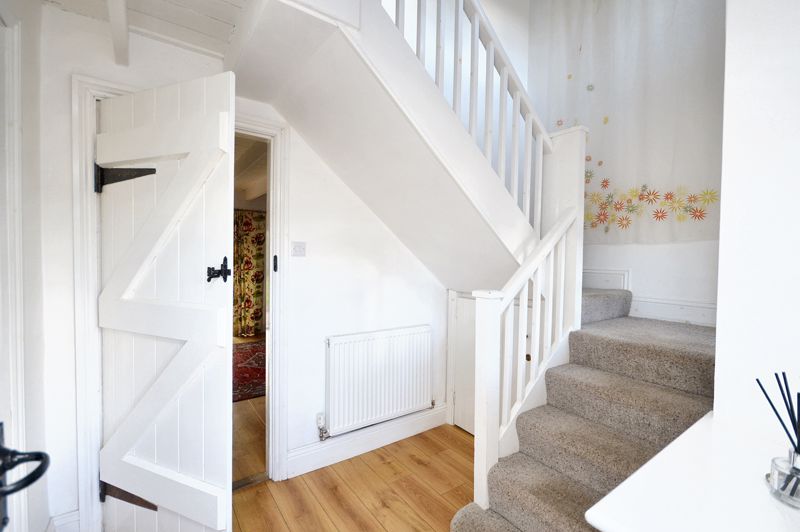 Window to porch | Radiator | Staircase to first floor | Under-stairs storage cupboard | Laminate flooring | Doors to W.C. and living room