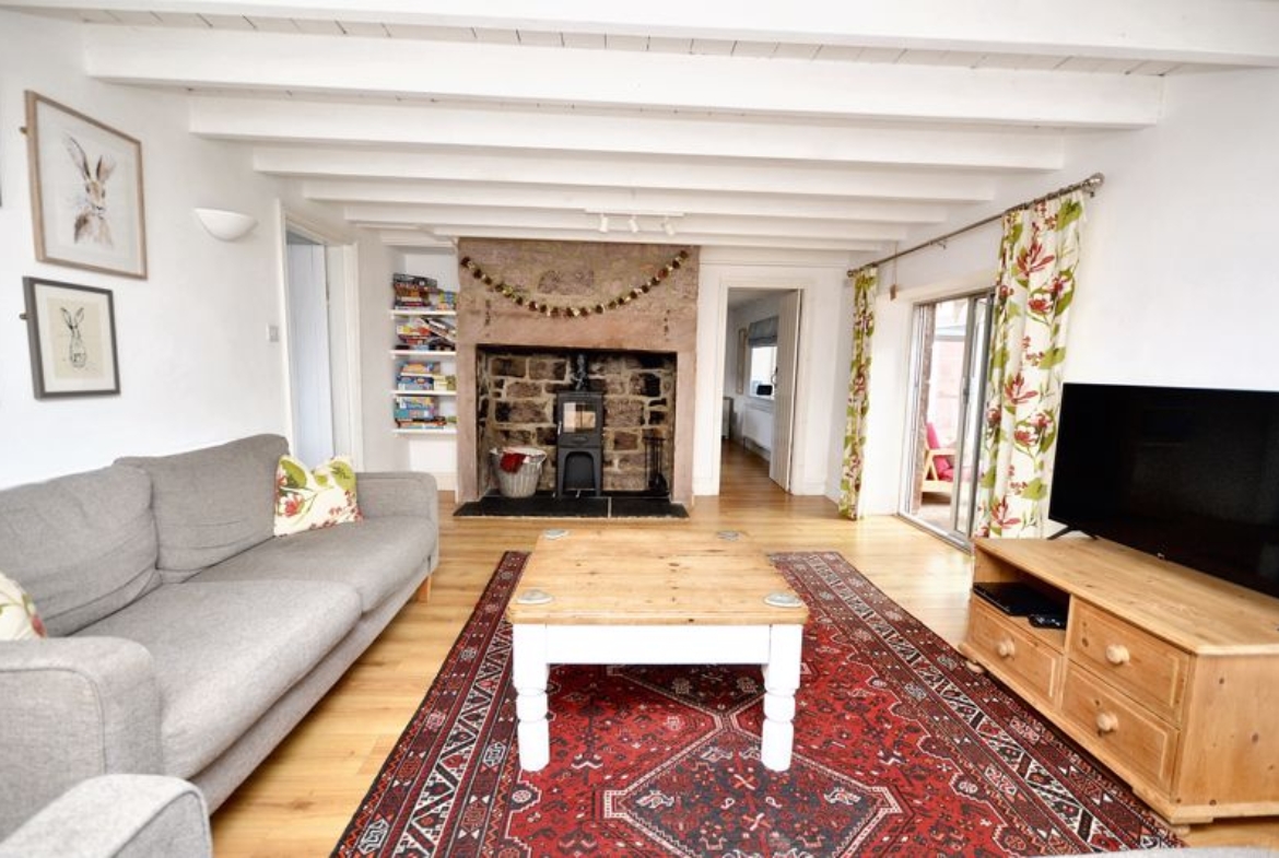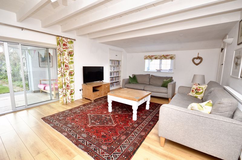 The main house offers two main generous size rooms, both with character features including exposed wood beams and large inglenook fireplaces. The spacious dining kitchen provides ample room for cooking and dining, complemented by a utility, and separate boot room/store room. The living room leads through to a long south-facing sun room at the rear that offers additional seating and dining space with views over the private lawned garden.