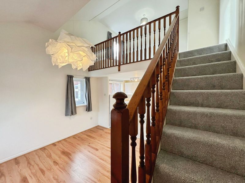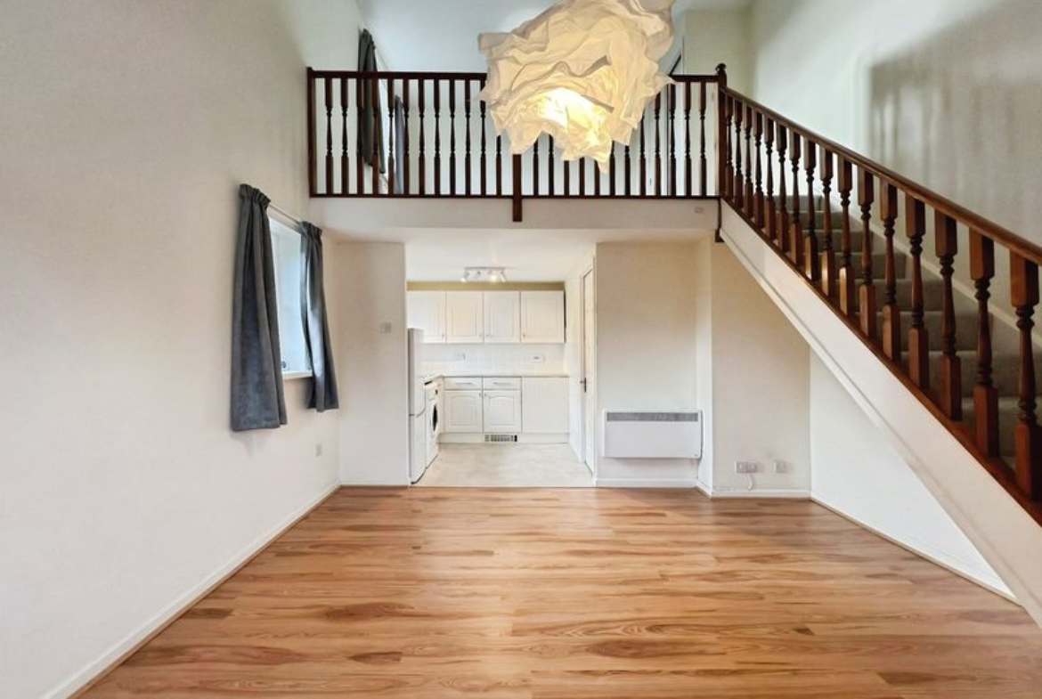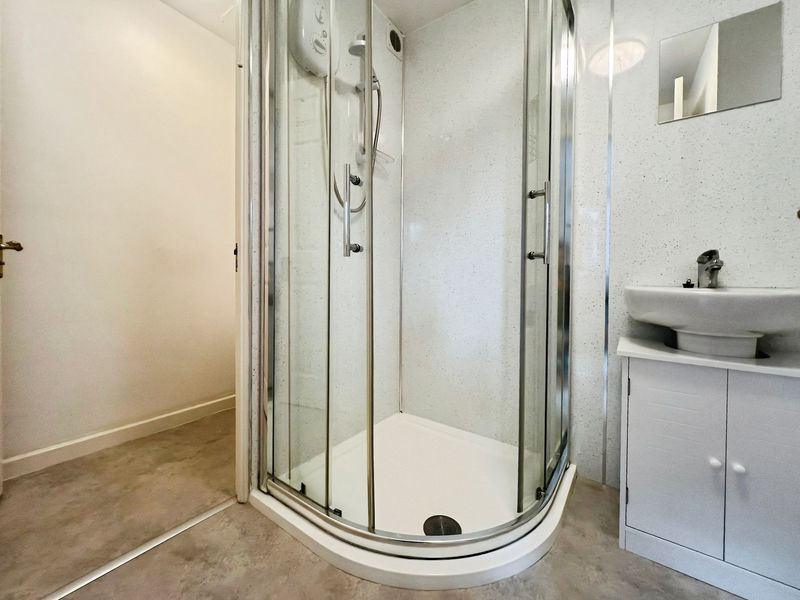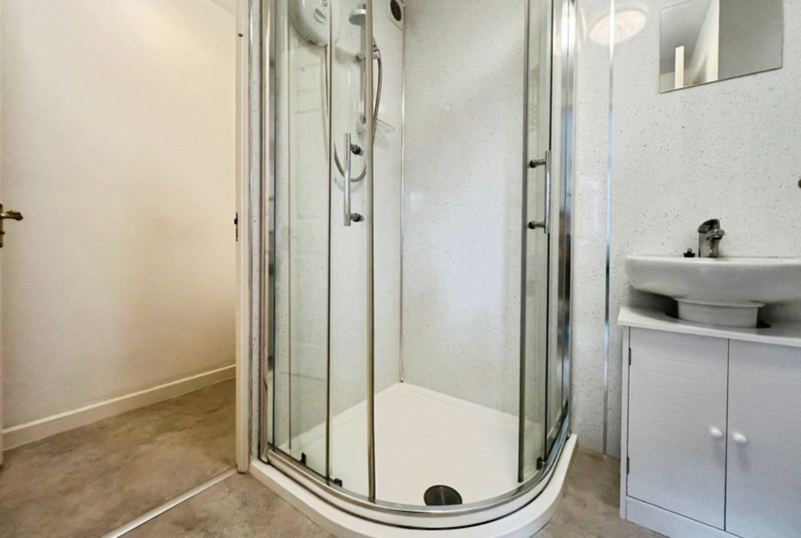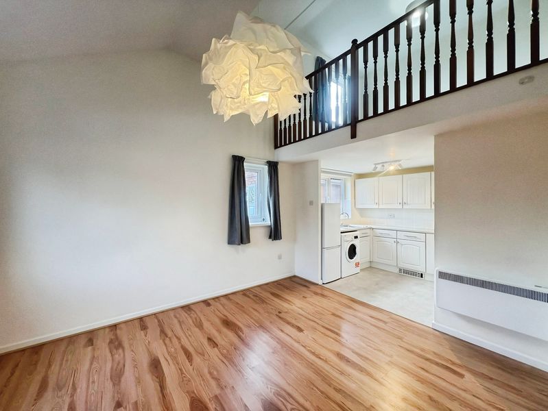 The main reception room is open-plan, providing a flexible living and dining area. The kitchen benefits from natural light, creating a practical space for everyday cooking. The double bedroom includes built-in wardrobes, offering integrated storage. The bathroom is fitted with a shower unit, and there is a separate WC.