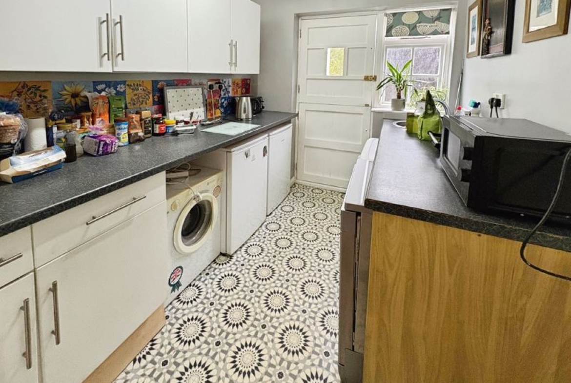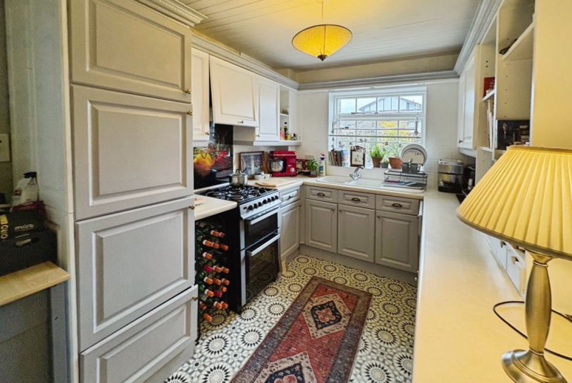 Fitted with a range of wall & base units, single drainer sink unit. Space for fridge freezer and dish washer, plumbed for washing machine. Window to front, stable door to side.