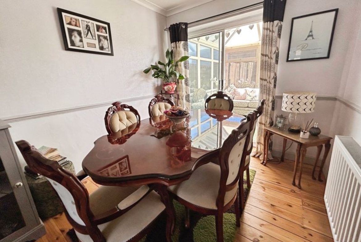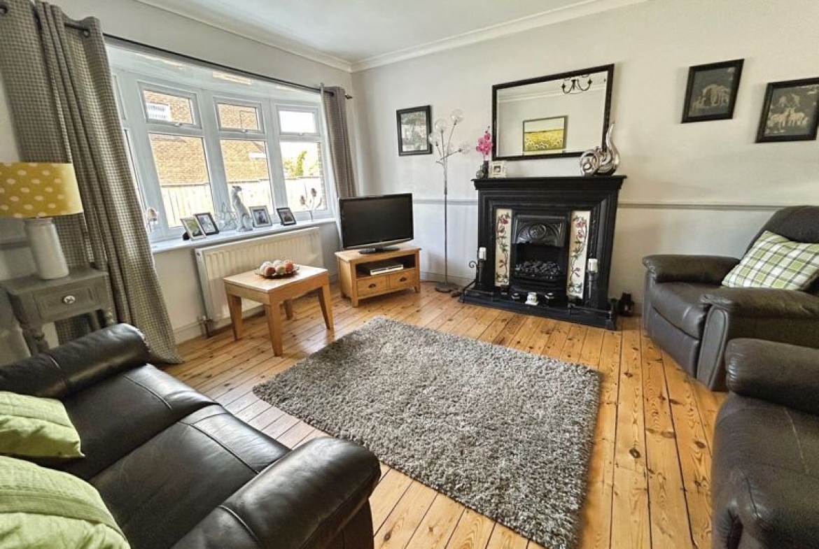 UPVC double glazed window to front, beautiful feature fireplace with surround, wood flooring, dao rail, coving to ceiling, two radiators, double glazed sliding doors to