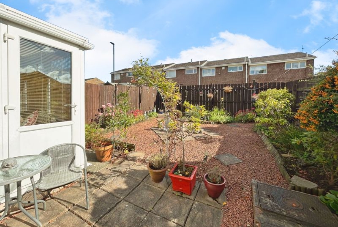 Rear: Mainly gravelled area, patio area, planted borders, fenced and walled boundaries.