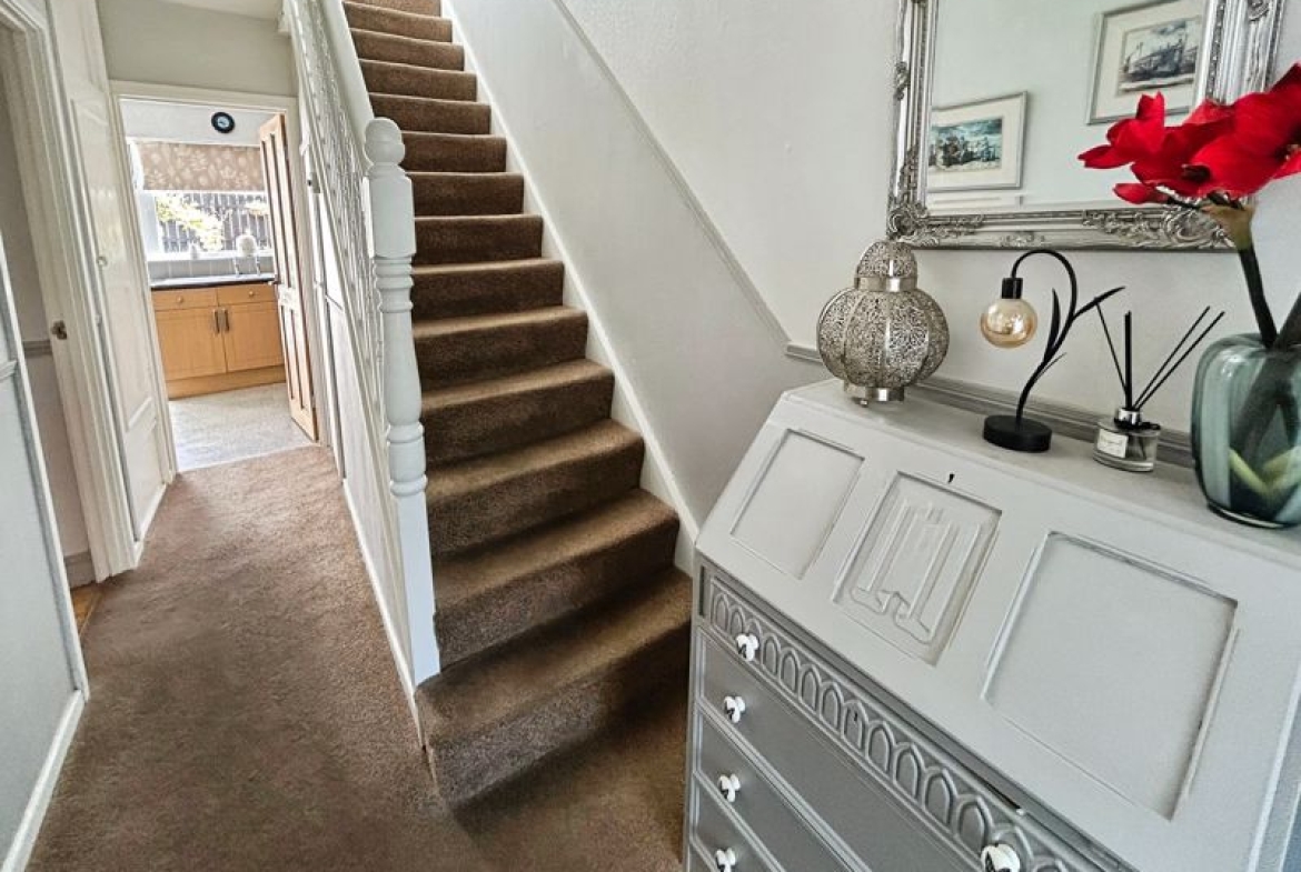 HALLWAY: Staircase to first floor, storage cupboard, under stairs storage cupboard.