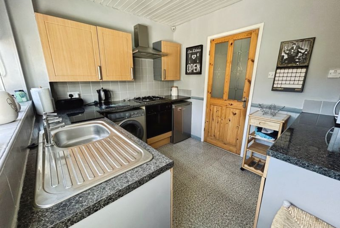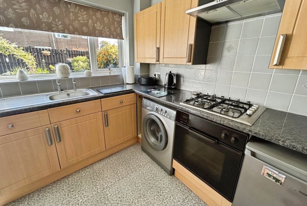 Fitted wall and base units with work surfaces incorporating a single drainer sink unit with mixer tap, gas hob, electric oven, extractor hood, space for washing machine, space for under bench fridge, space for under bench freezer, spotlights to ceiling, radiator, UPVC double glazed window to rear, UPVC door to rear garden.