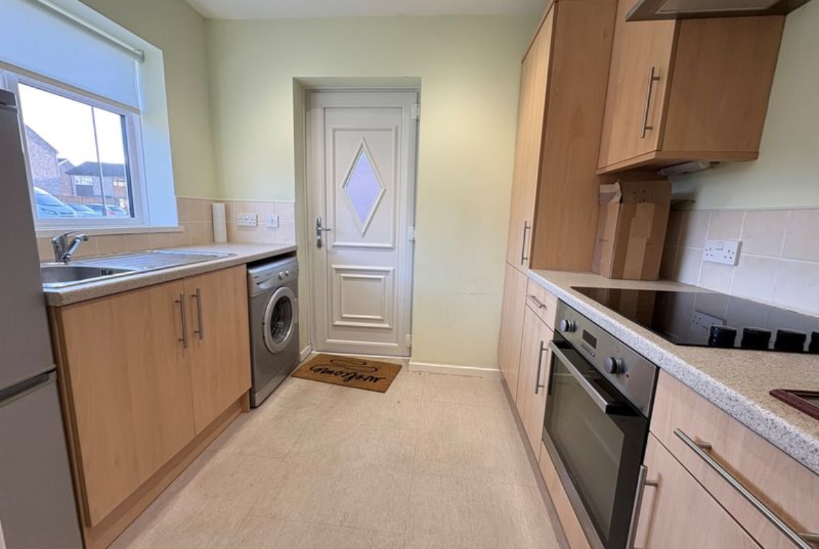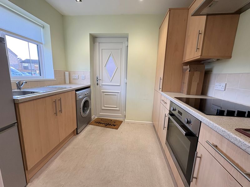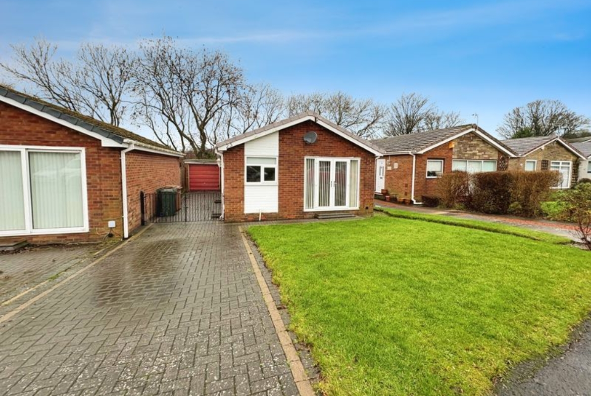 As you step inside the hallway connects to the main living spaces including a bright open plan lounge with dining area featuring full length windows to the front incorporating French doors, filling the room with natural light. From here the kitchen is accessed fitted with attractive wall and base units , integrated oven and hob and space for additional appliances. Two good proportioned bedrooms overlook the rear garden with the well appointed family bathroom completing the accommodation .The bungalow enjoys a lawned area to the front with extensive block paved double length driveway leading to detached garage and enclosed rear garden.