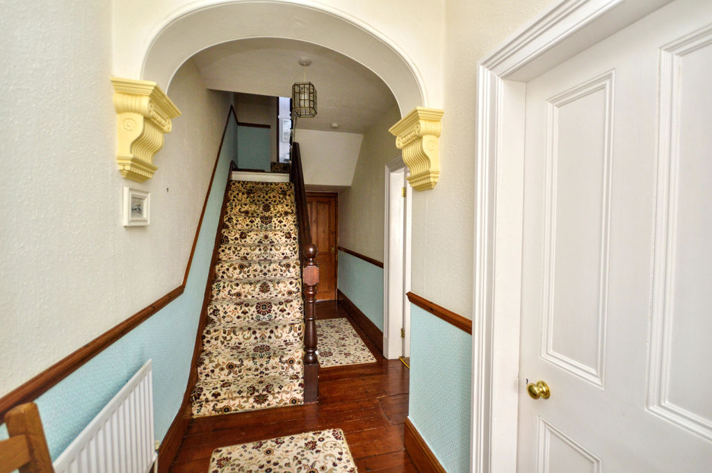 Feature arch with decorative plasterwork mouldings | Original cornice | Dado rail | Under stairs storage cupboard | Spindle staircase leading to first floor | Radiator | Doors to reception rooms and kitchen | Stripped wood floor