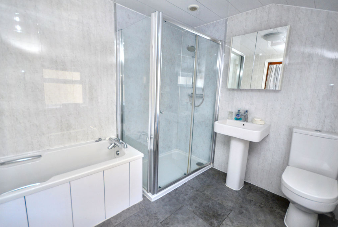 Bath | Double shower cubicle with mains shower | Close coupled W.C. | Pedestal wash-hand basin | Radiator | Wall-mounted mirrored door vanity cabinet | Extractor fan | Wet-wall panelled walls and UPVC panelled ceiling