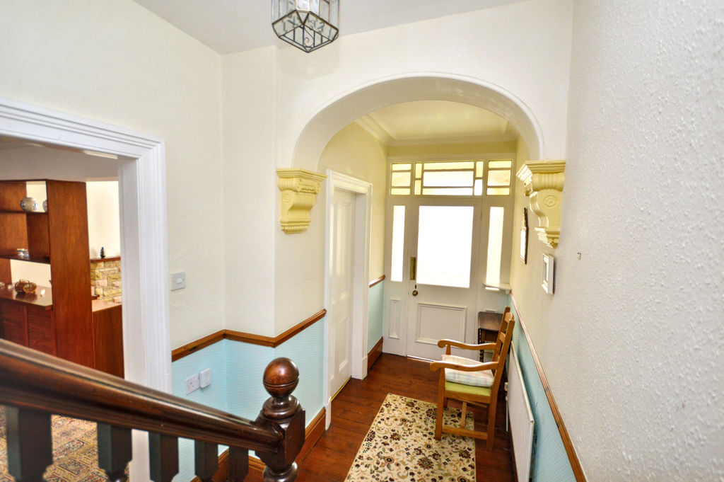 Double-glazed composite entrance door | Original cornice | Courtesy light | Cupboard housing electric meter and fuse box | Tiled floor | Part-glazed door with etched glass and stained-glass windows leading through to main hall