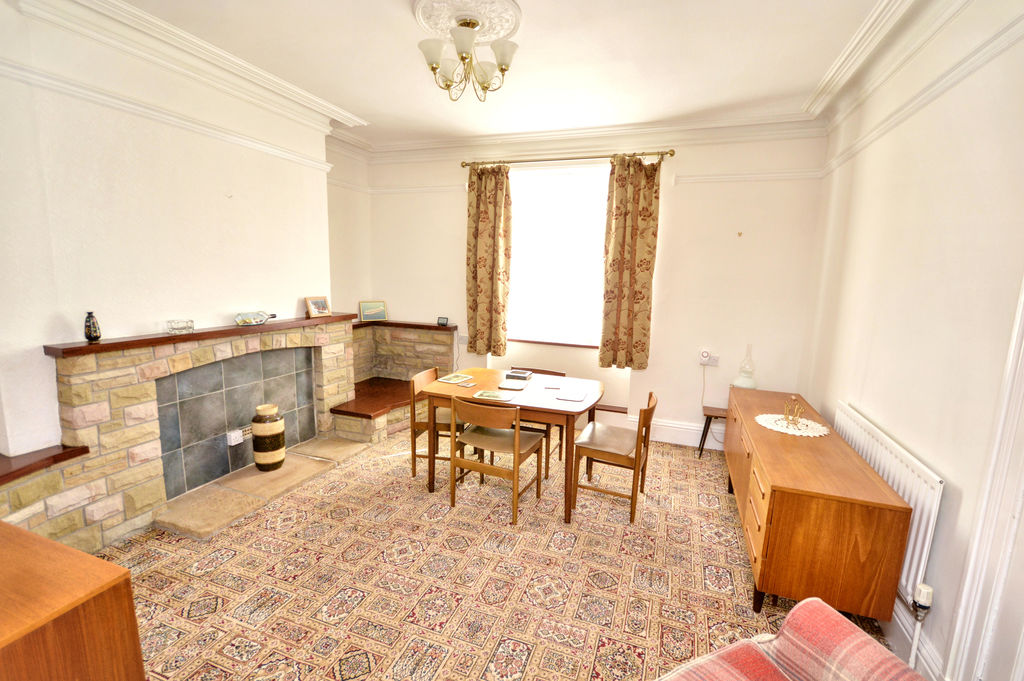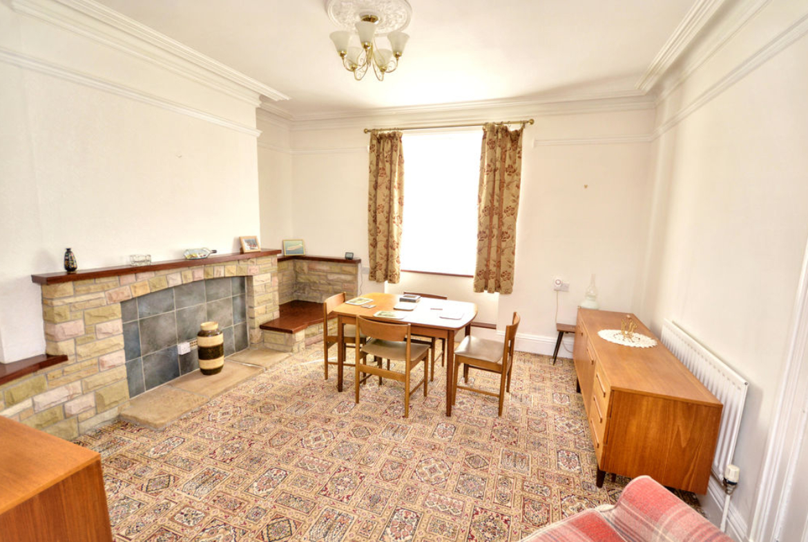 UPVC double-glazed window | Original cornice | Ceiling rose | Picture rail | Radiator | Stone fireplace with display shelves and stone hearth with a tiled inset | Square arch to living room