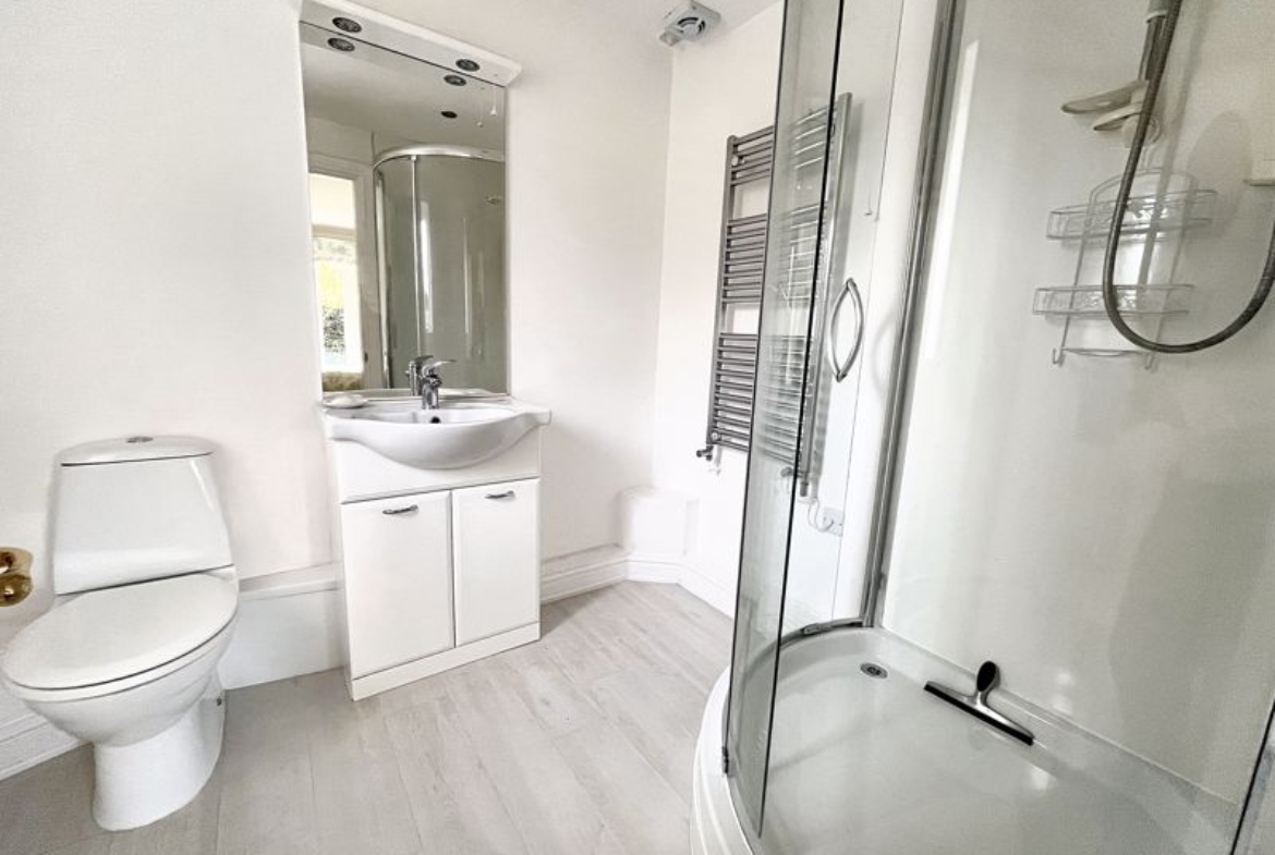 UPVC double-glazed frosted window | Close-coupled W.C | Cabinet with integrated wash-hand basin | Corner shower cubicle with wet wall panels and electric shower | Chrome ladder style electric radiator | Laminate flooring | Fitted cabinet