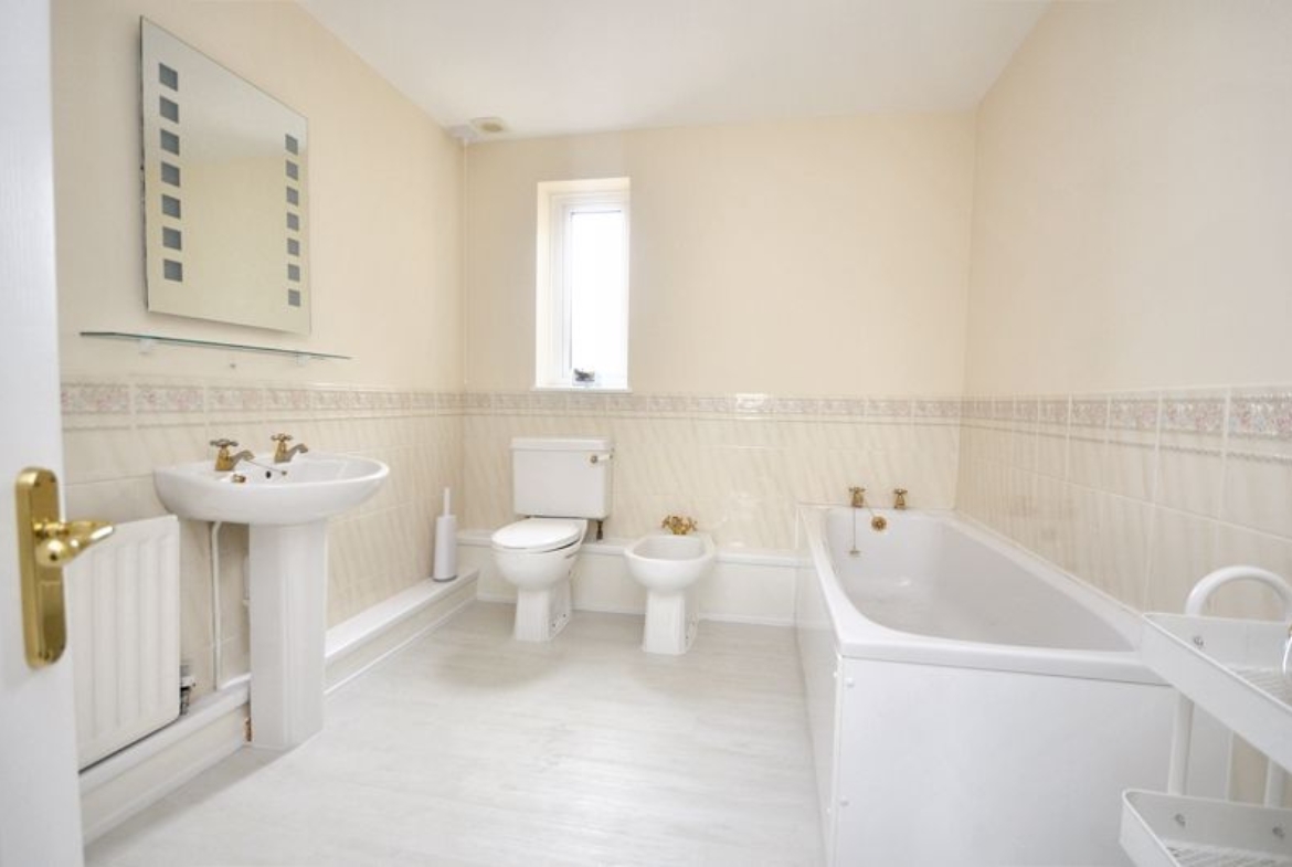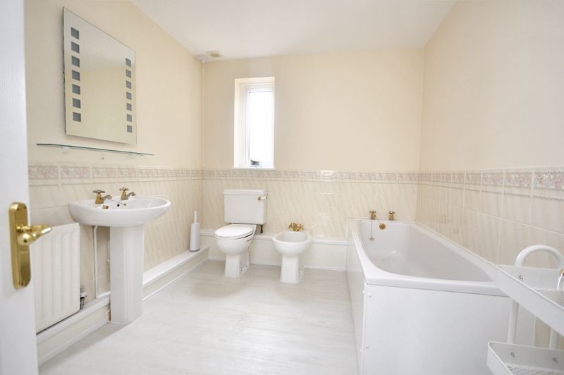 UPVC double-glazed frosted window | Pedestal wash-hand basin | Close coupled W.C | Bidet | Bath | Part-tiled walls | Radiator | Extractor fan | Shelved cupboard