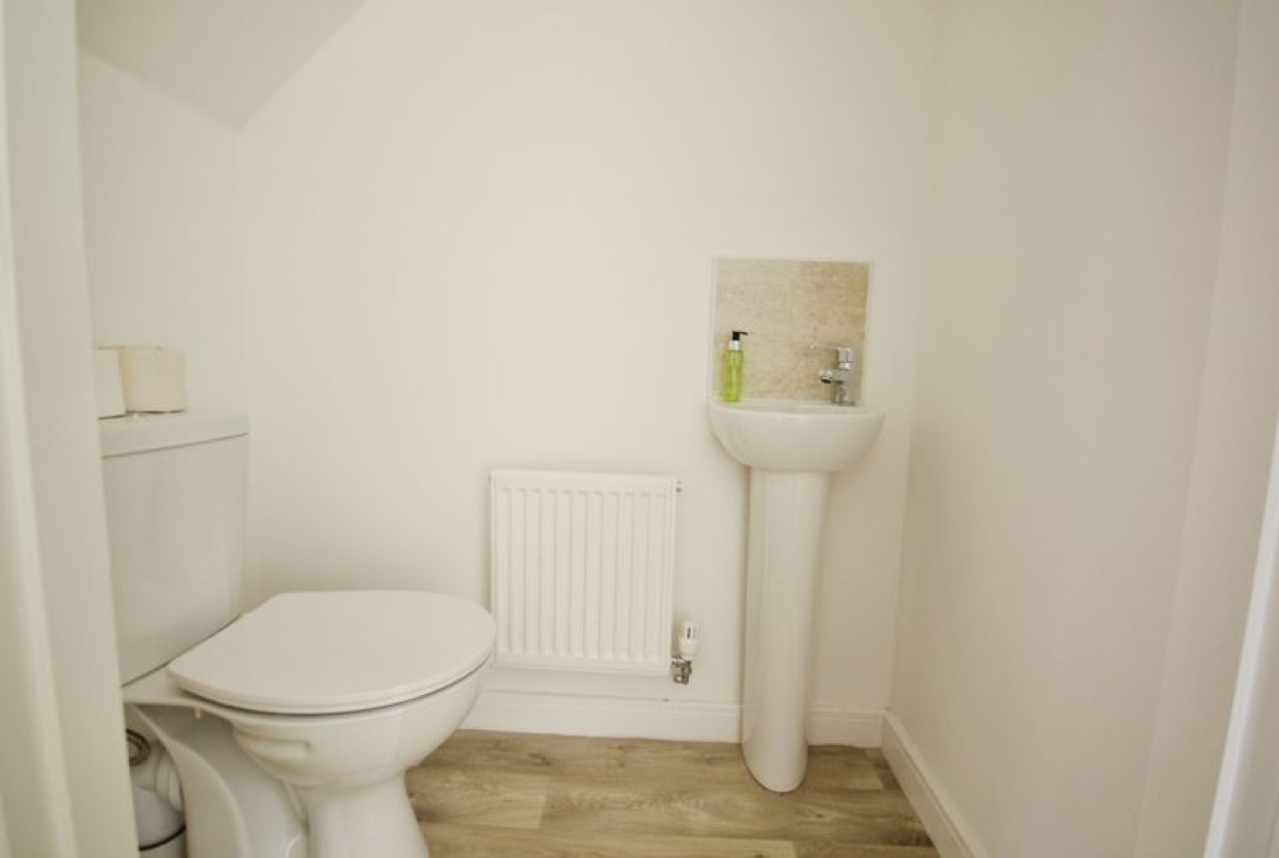 Close coupled W.C., pedestal wash hand basin, radiator, vinyl flooring, extractor, downlights