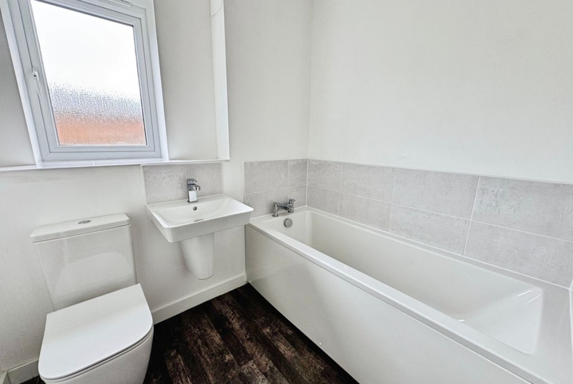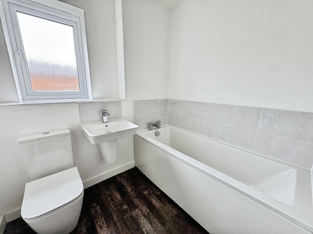 UPVC window, bath, low level wc, wash hand basin, part tiled and radiator.