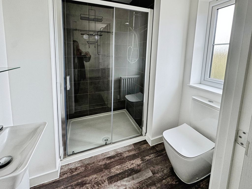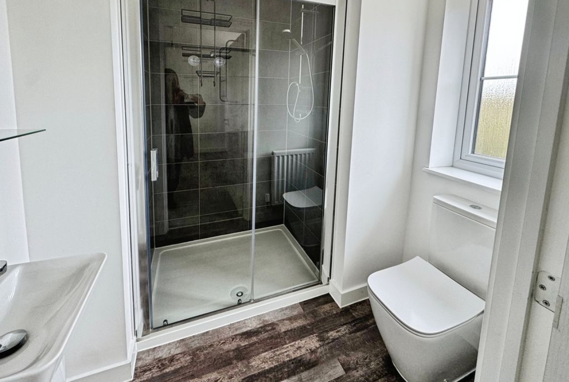 UPVC window, large shower, low level wc, wash hand basin, part tiled and radiator.