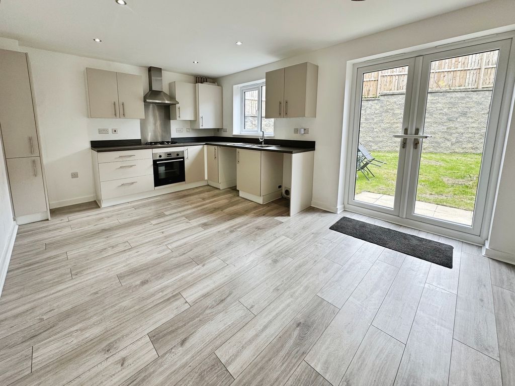 UPVC window, UPVC French doors to the garden, fitted with a range of matching wall and base units with work surfaces above incorporating one and a half bowl sink unit with drainer, integrated gas hob, electric oven, plumbed for washing machine, dining space and radiator.