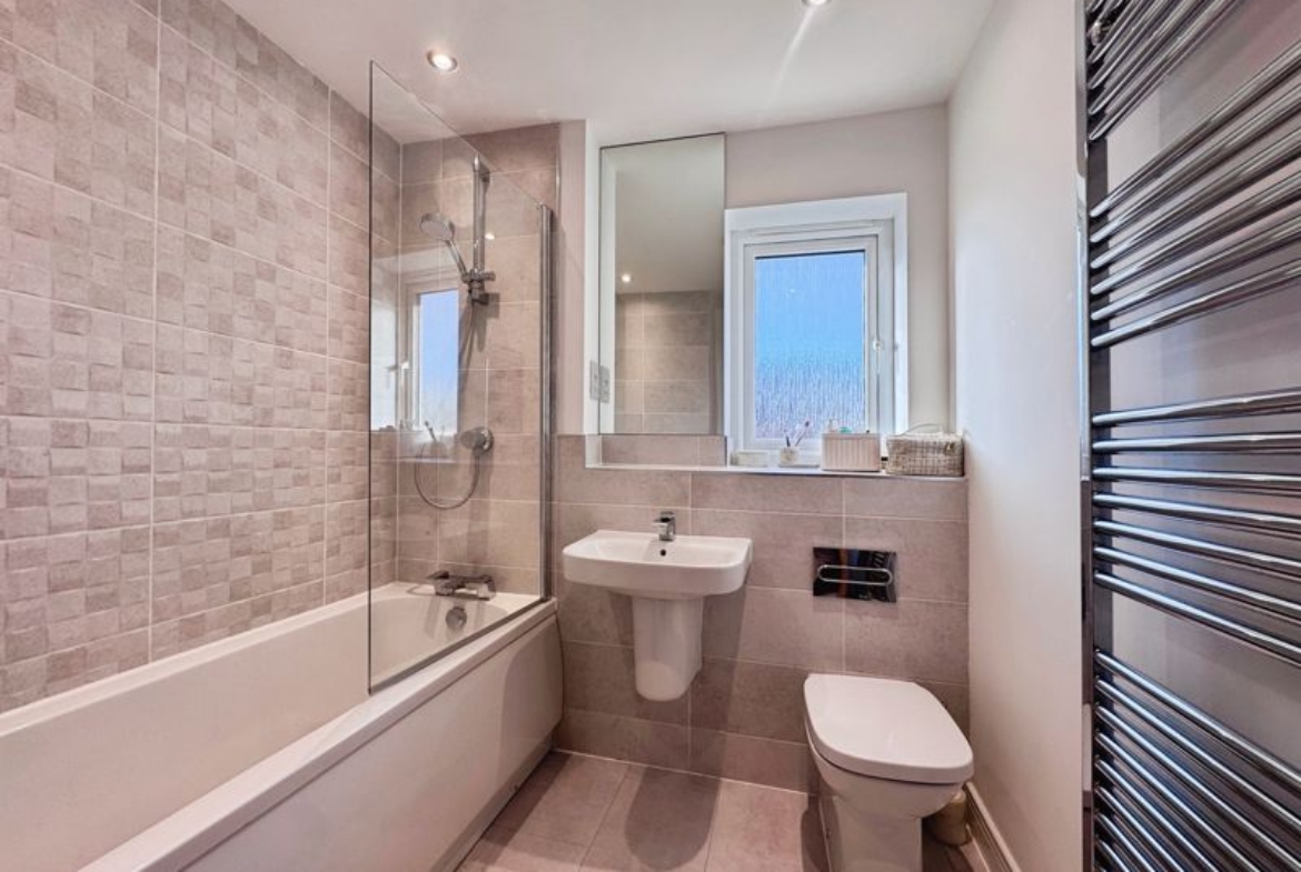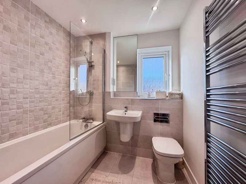 UPVC window, bath with shower, low level wc, wash hand basin, part tiled and heated towel rail.