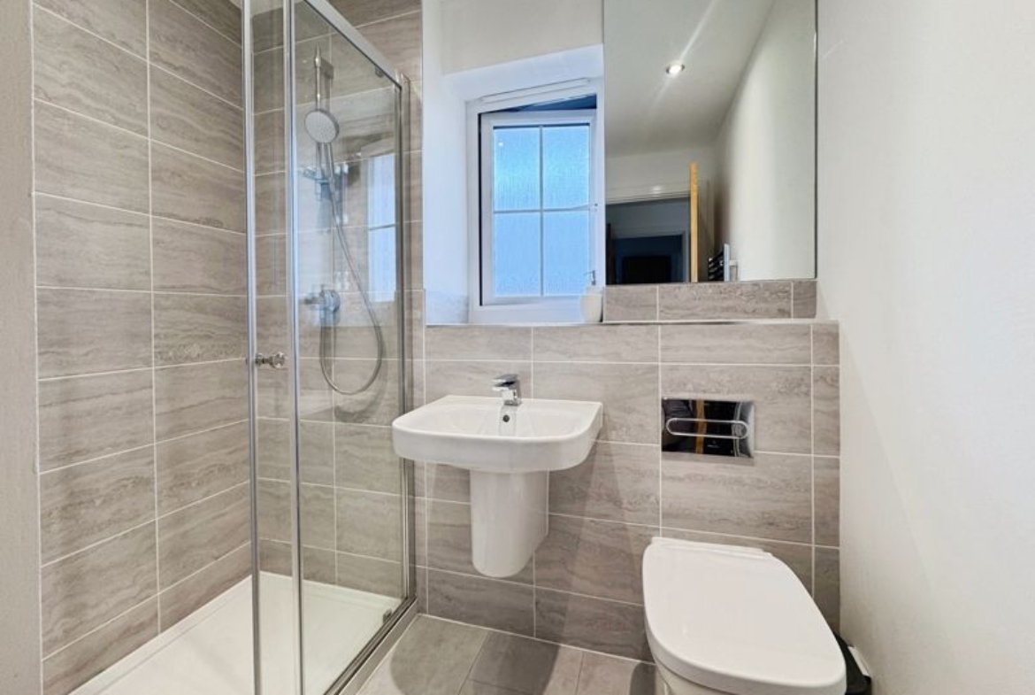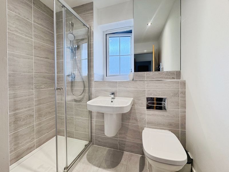 UPVC window, shower, low level wc, wash hand basin, part tiled and heated towel rail.