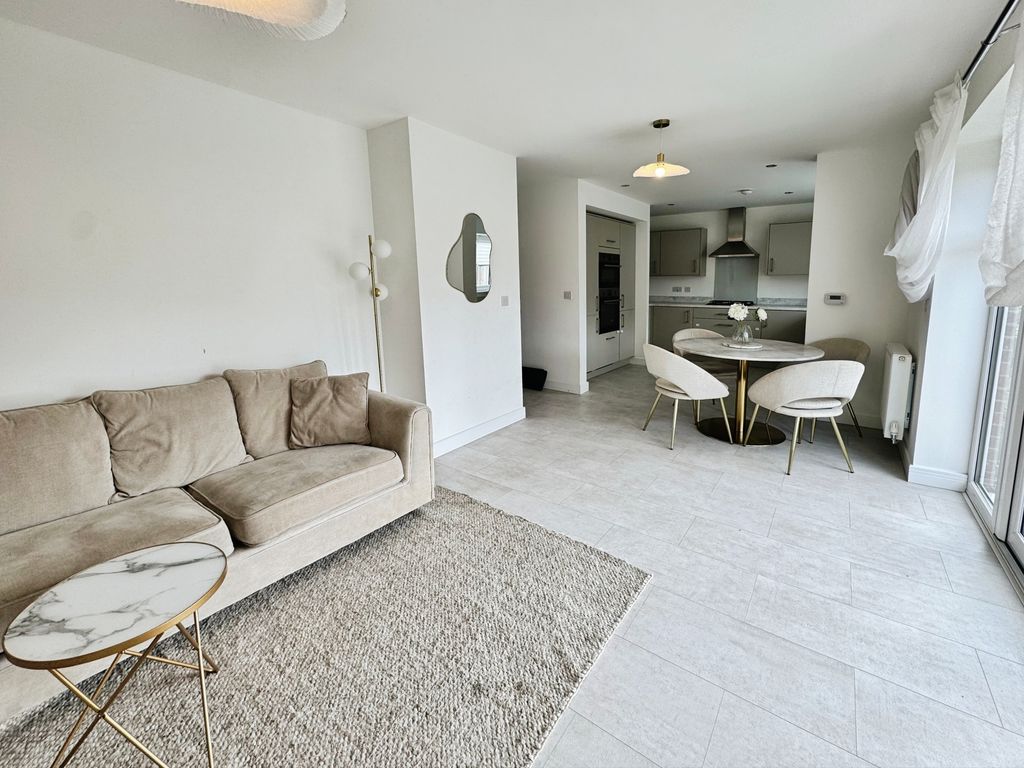 The property has one reception room with large windows, providing natural light throughout the space. The open-plan kitchen includes dedicated dining and family areas, complete with French doors leading to a large west-facing garden. Additional features include a garage and double driveway.