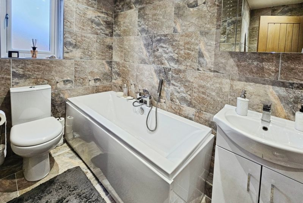 Three-piece white suite comprising of; panelled bath, wash hand basin (set in vanity unit), low level wc, spotlights, double glazed window to rear, heated towel rail, tiling to walls and flooring, extractor fan.