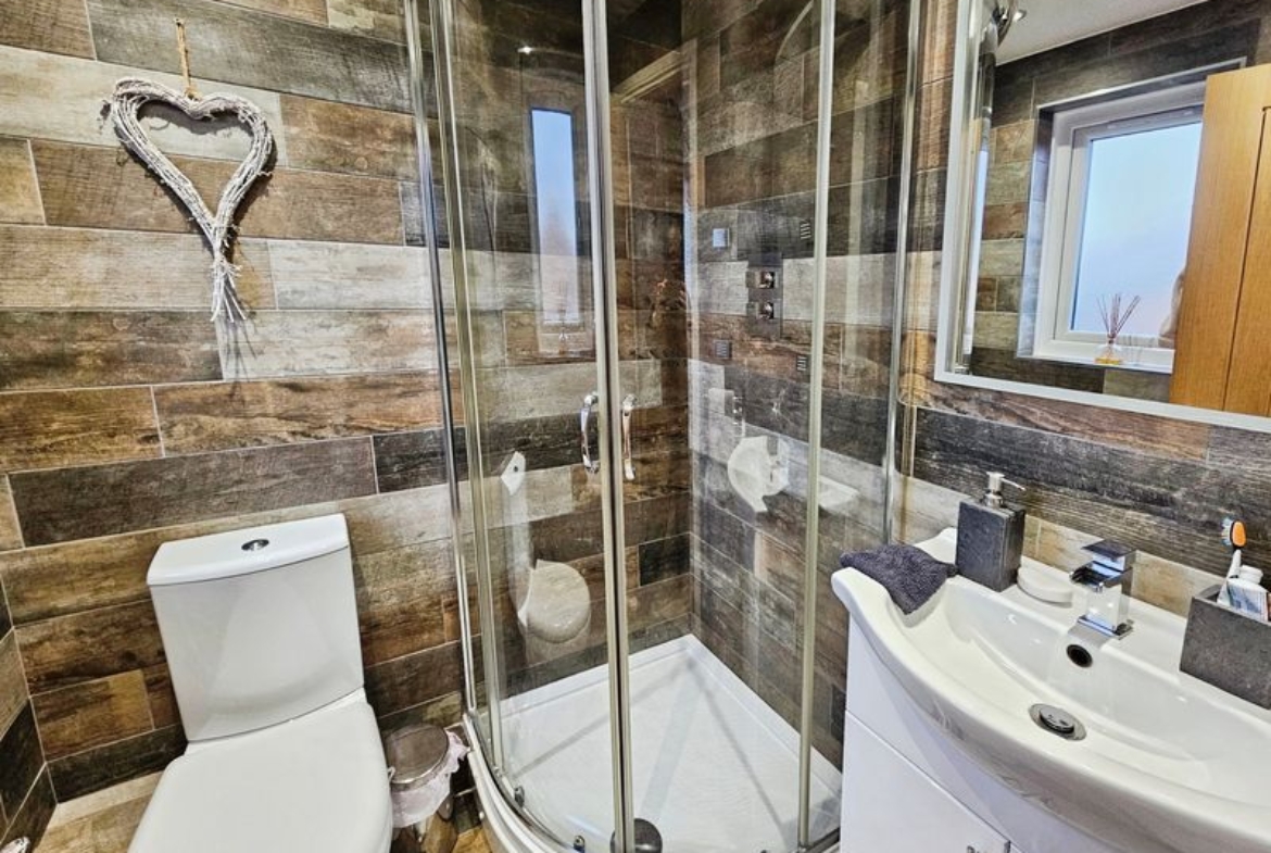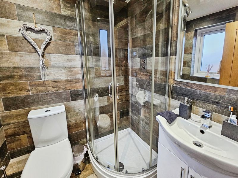 Double glazed window to rear, low level wc, wash hand basin (set in vanity unit), extractor fan, shower cubicle (mains shower), tiled walls and flooring, heated towel rail, spotlights, laminate flooring.