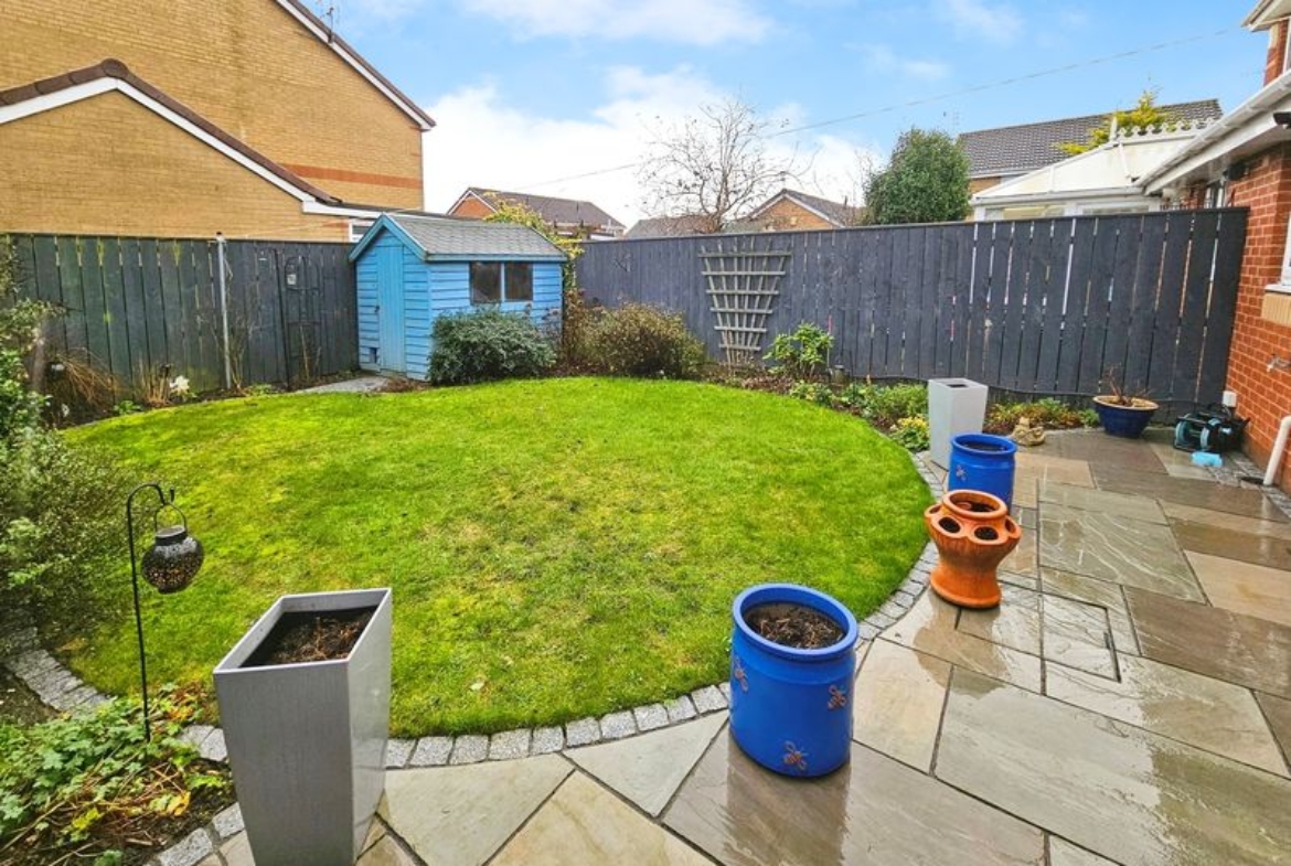 Front Garden laid mainly to lawn, driveway leading to garage. Rear garden laid mainly to lawn, patio area, flower beds, bushes and shrubs, water tap, garden shed.