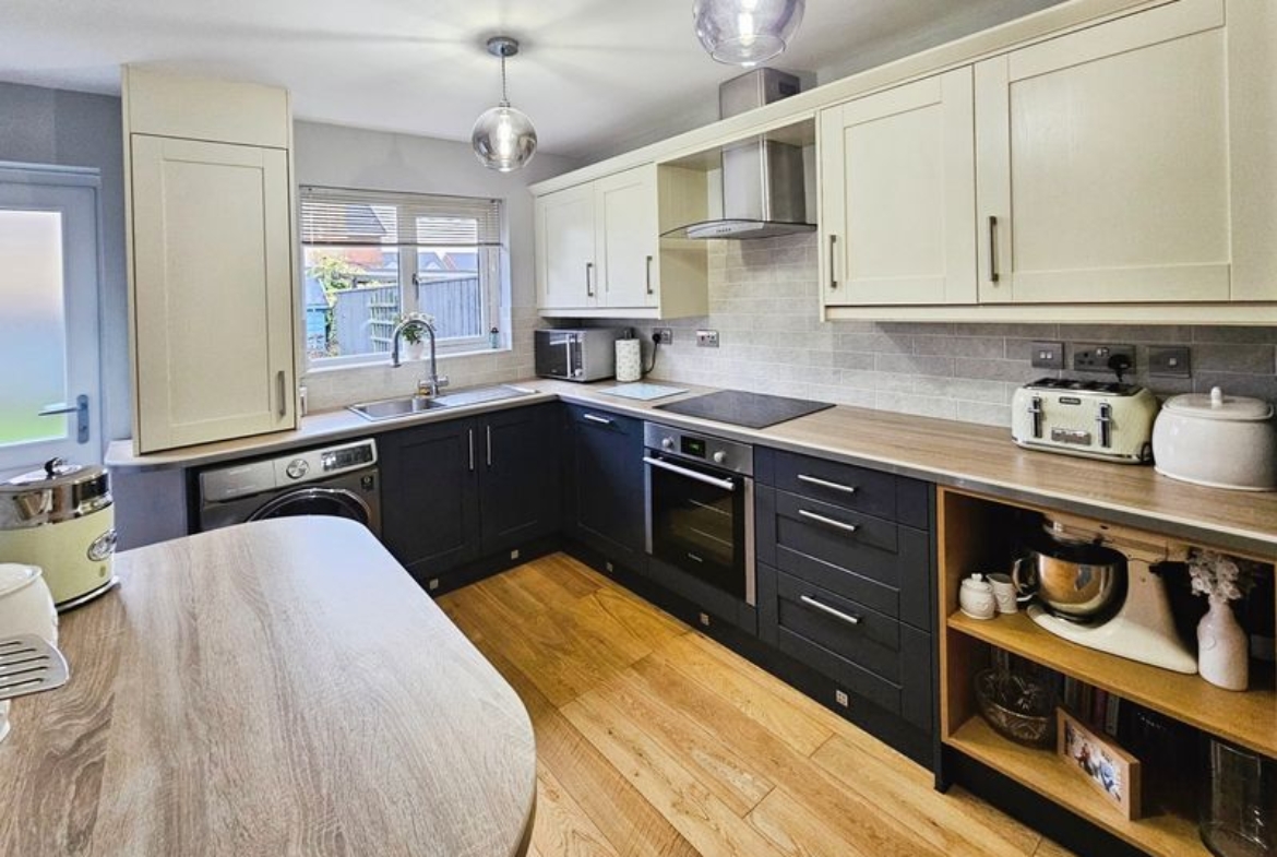 Double glazed window to rear, double radiator, fitted with a range of wall, floor and drawer units with co-ordinating roll edge work surfaces, stainless steel sink unit and drainer with mixer tap, tiled splash backs, built in fan assisted oven, electric hob with extractor fan above, space for fridge, integrated dishwasher, plumbed for washing machine, laminate flooring, double glazed door to rear.
