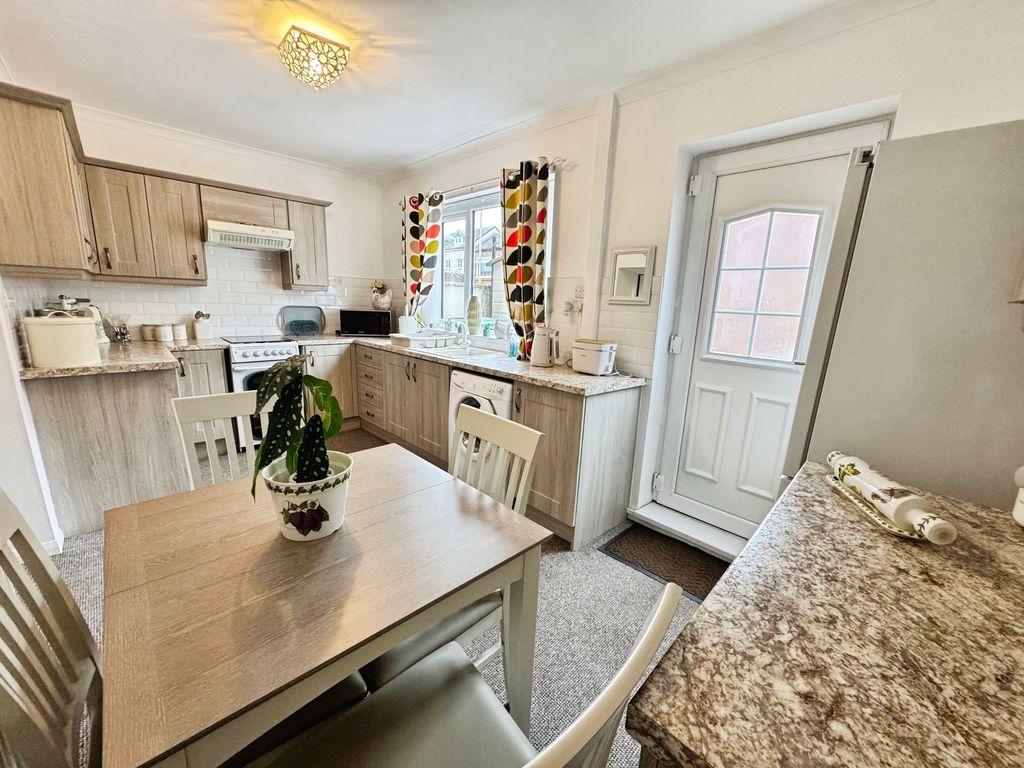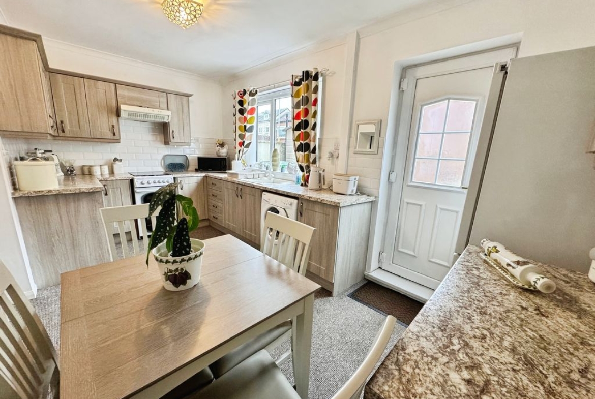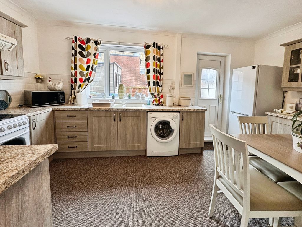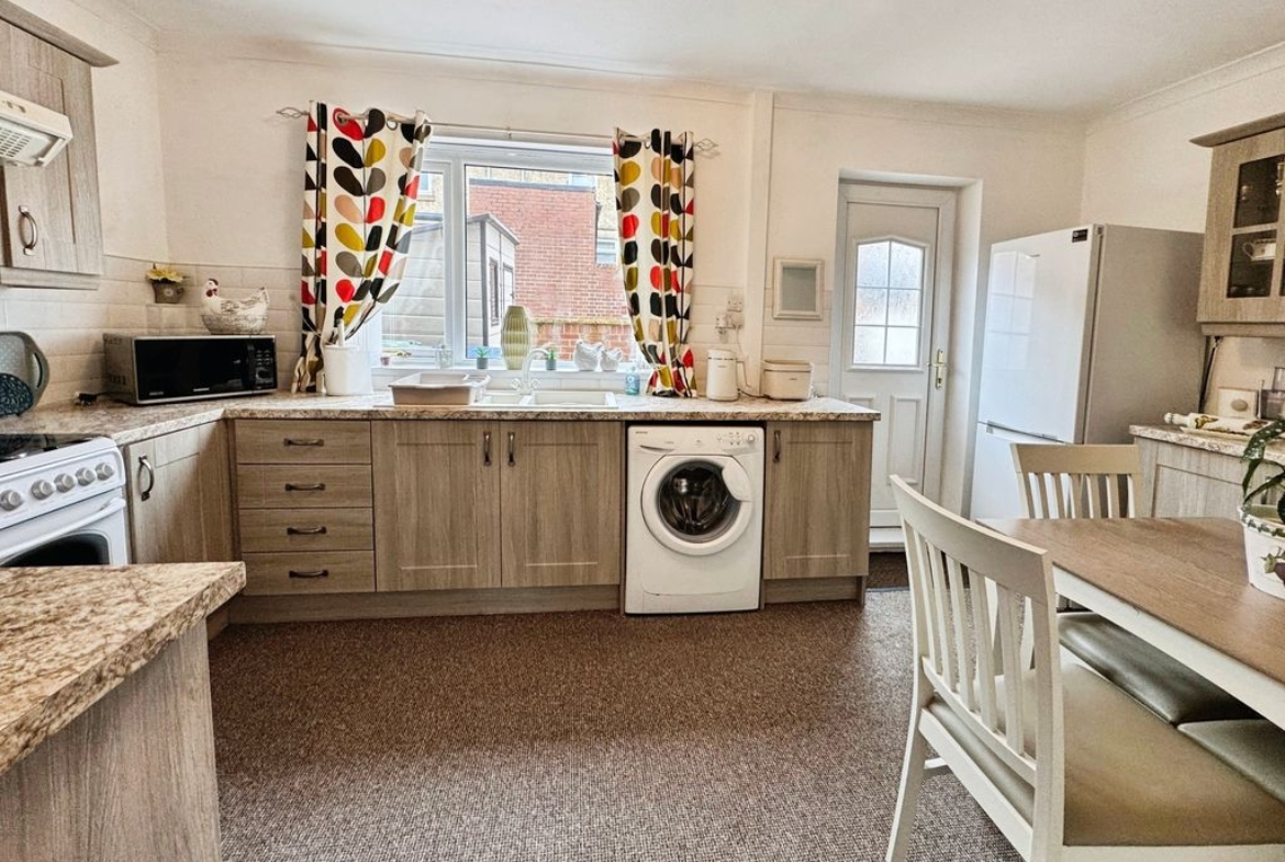 UPVC door to the rear, UPVC window, fitted with a range of matching wall and base units with work surfaces above incorporating one and a half bowl sink unit with drainer, space for free standing cooker, plumbed for washing machine, dining space and radiator.