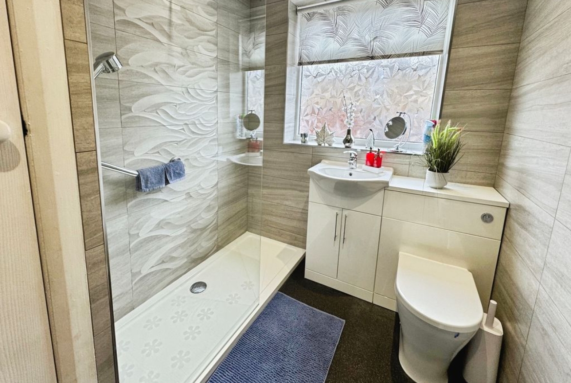 UPVC window, large walk in shower, low level wc, vanity wash hand basin, fully tiled, storage and heated towel rail.