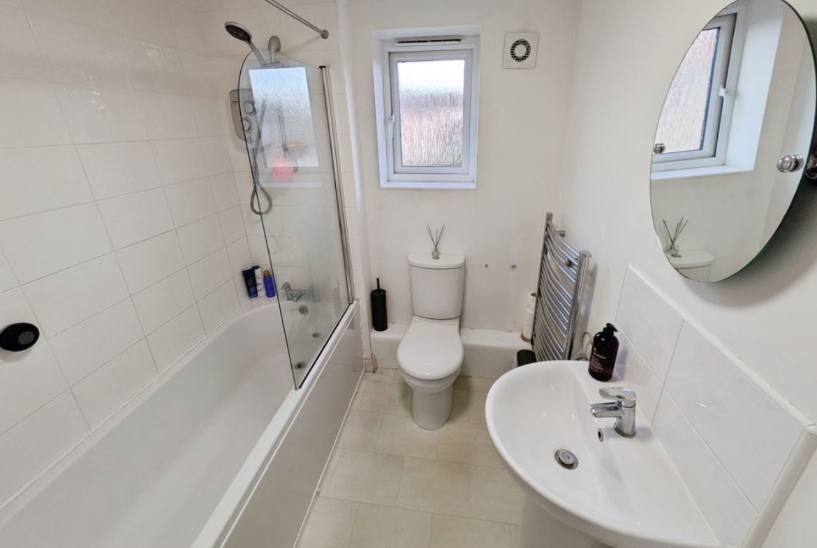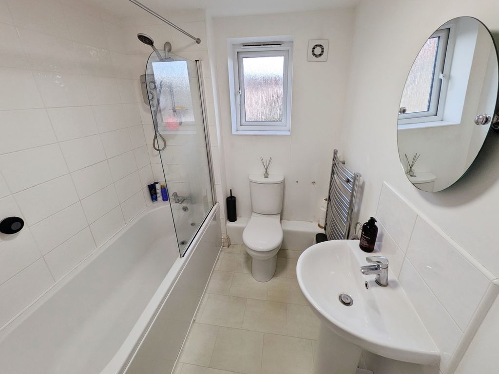 UPVC window, bath with shower, low level wc, wash hand basin and heated towel rail.