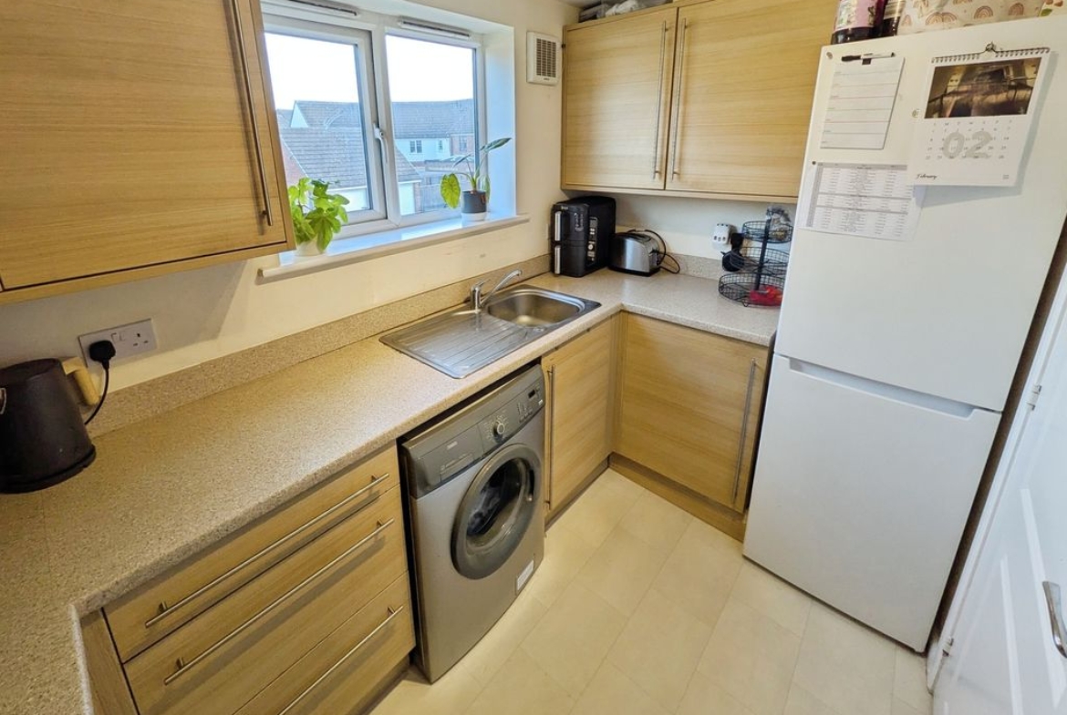 UPVC window, fitted with a range of matching wall and base units with work surfaces above incorporating stainless steel sink with drainer, integrated electric hob and oven, plumbed for washing machine.