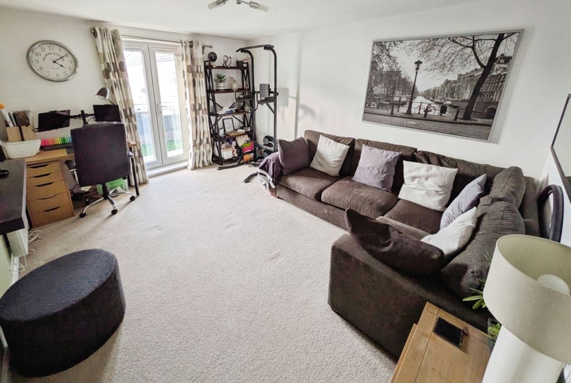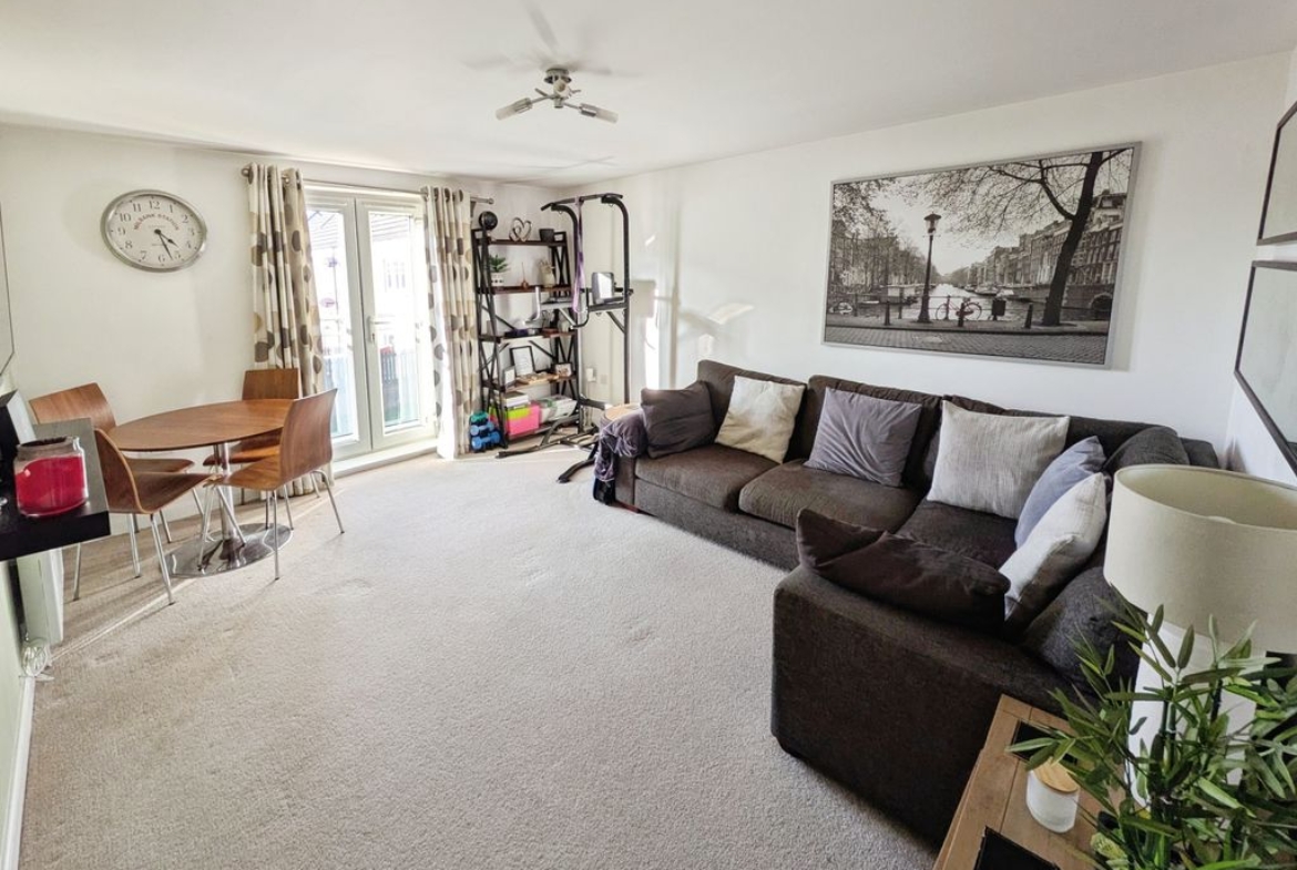 The property features a lounge/dining room with a Juliet balcony, offering a pleasant outlook and space for both seating and dining. The kitchen has a fitted oven, hob and extractor hood. There are two double bedrooms and a bathroom fitted with a heated towel rail. There are storage cupboards to the hallway and second bedroom. An external bike shed and an allocated parking bay provide useful storage and parking solutions, while a communal garden adds outdoor space for residents.