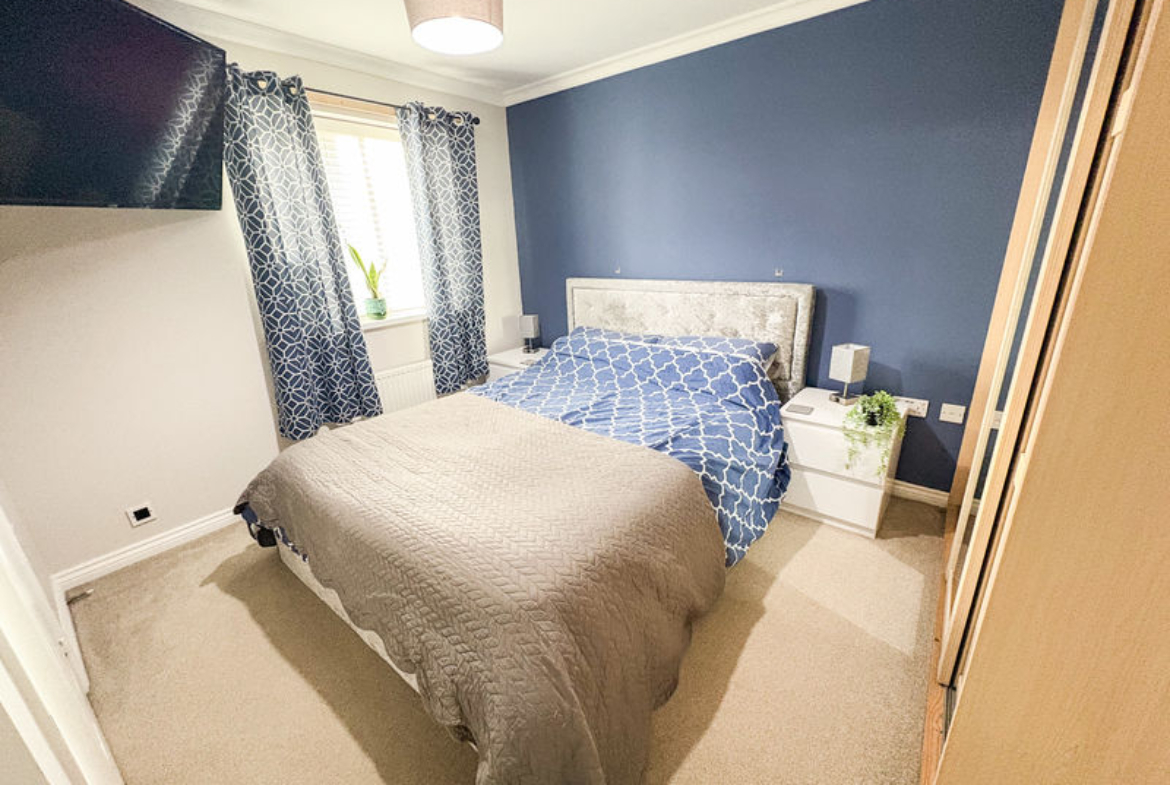 BEDROOM ONE: (rear): 11’64 x 10’24, (3.54m x 3.12m), double glazed window to rear, single radiator, and fitted wardrobes.
