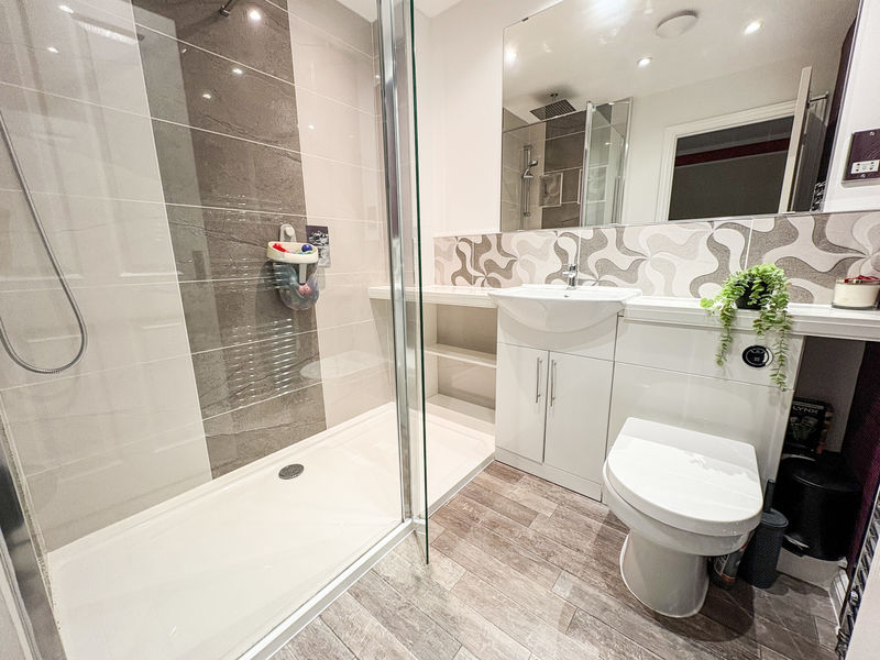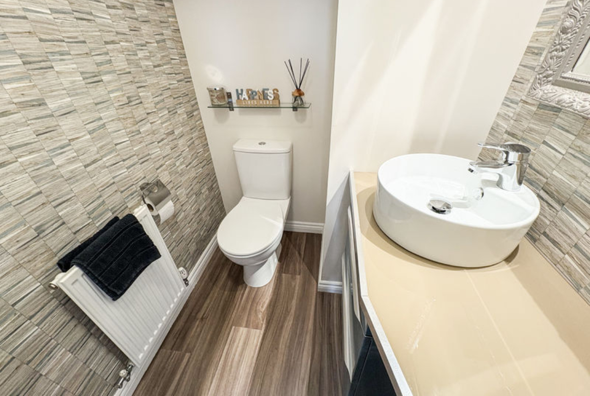 To the first floor, there are three well-proportioned bedrooms, providing flexible accommodation for families, guests or home working. The modern shower room is immaculately presented and fitted with a stylish suite that blends contemporary design with functionality.