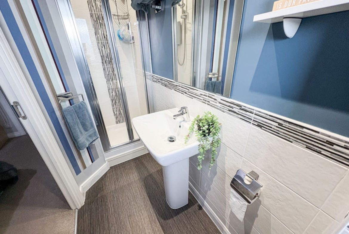SHOWER ROOM: 3 piece suite comprising wash hand basin, shower cubicle, low level WC, spotlights, and heated towel rail, part tiling to walls and built in shower cubicle.