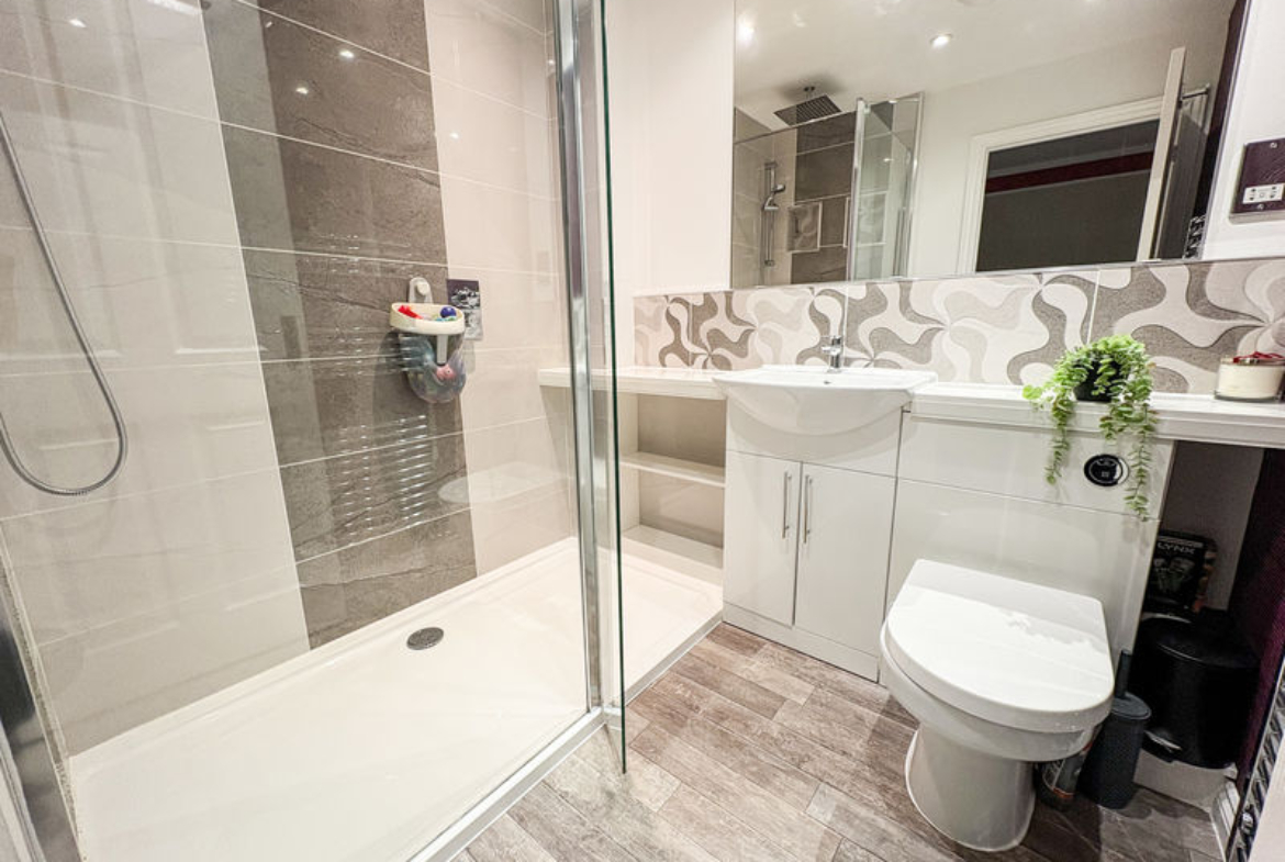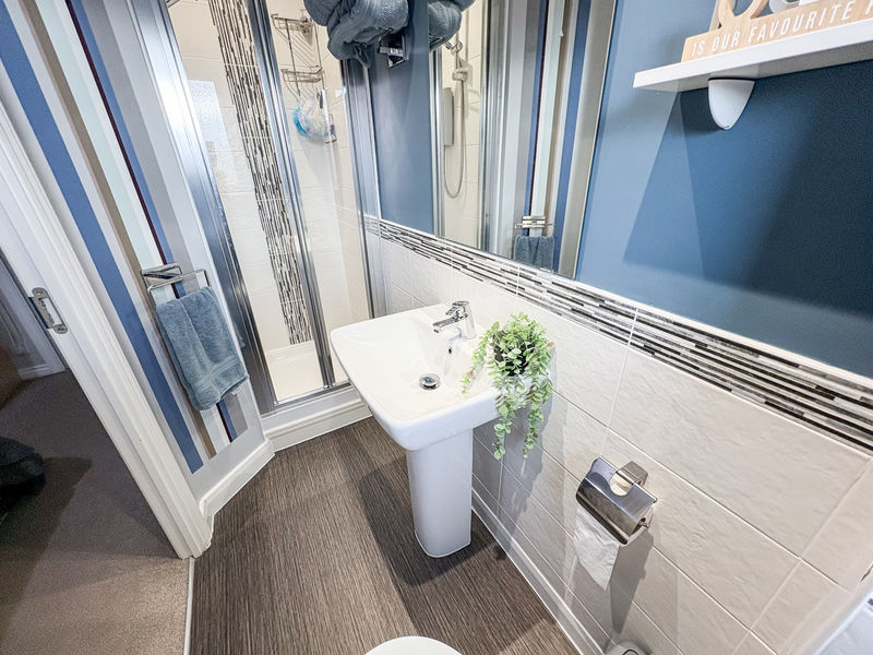EN-SUITE SHOWER ROOM: double glazed window to rear, low level WC, hand basin, single radiator, and shower cubicle.