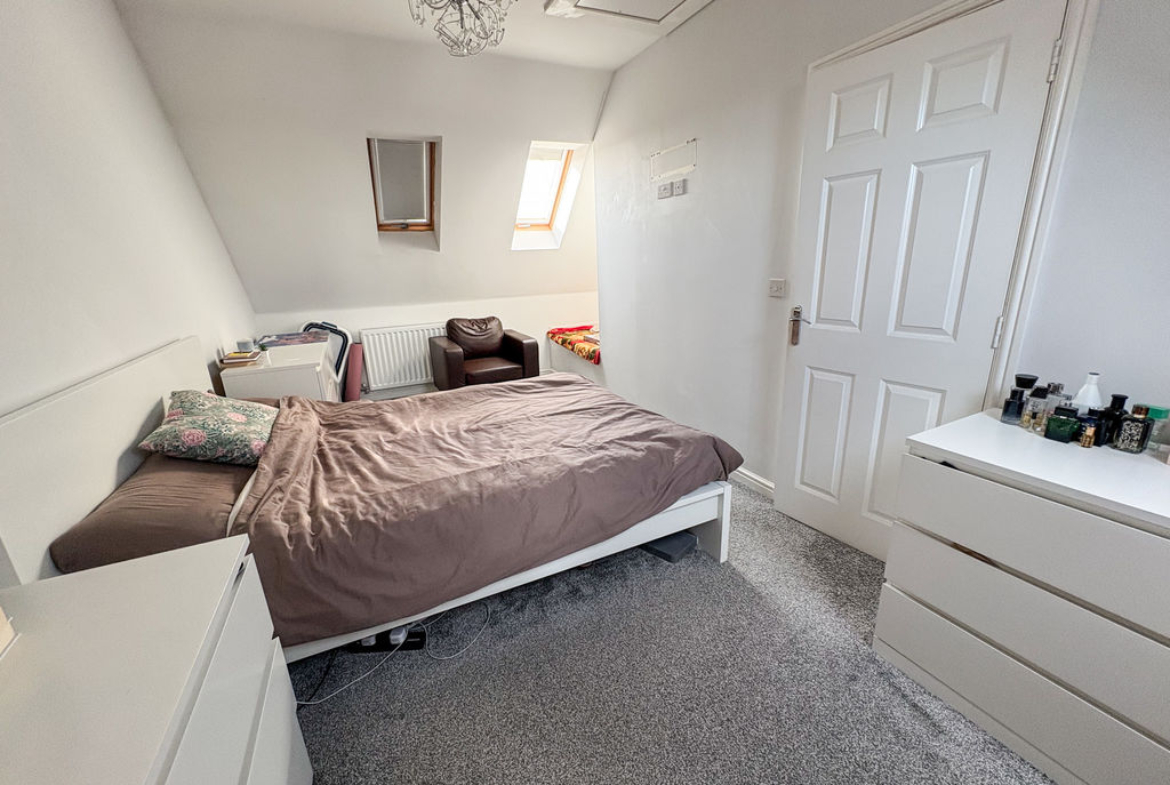 The top floor is dedicated to the main bedroom, providing a generous and private space complete with fitted wardrobes for useful storage.