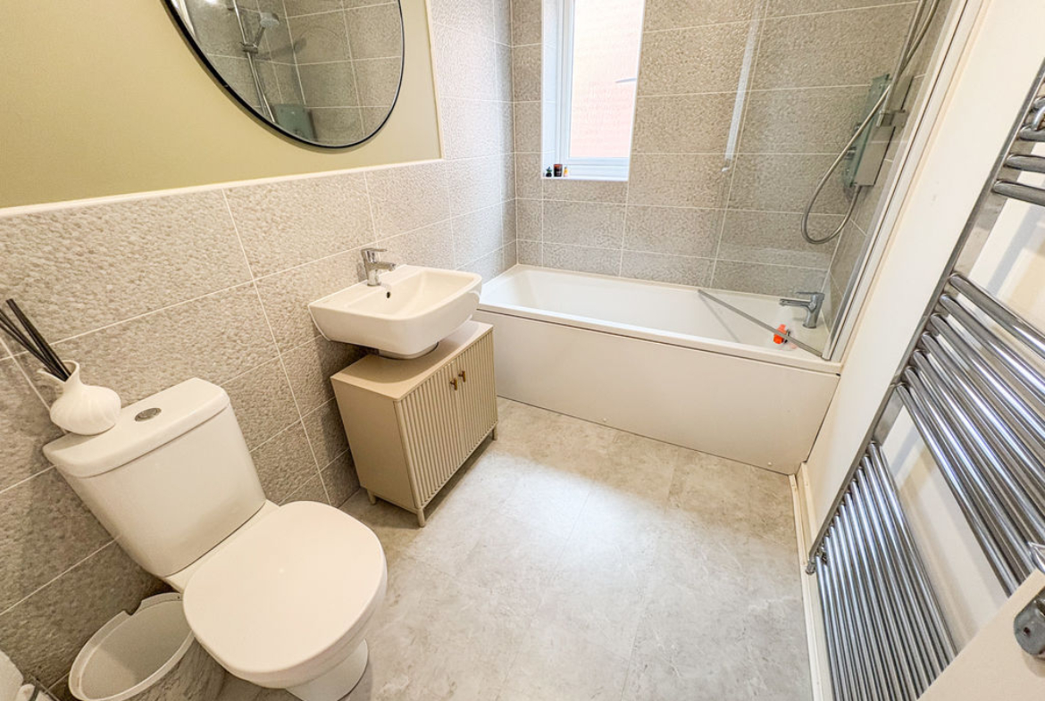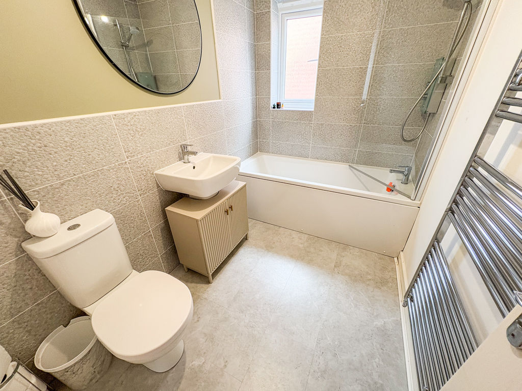 FAMILY BATHROOM: 3 piece suite comprising panelled bath, shower over, wash hand basin, low level wc, double glazed window to side, heated towel rail and part tiling to walls.