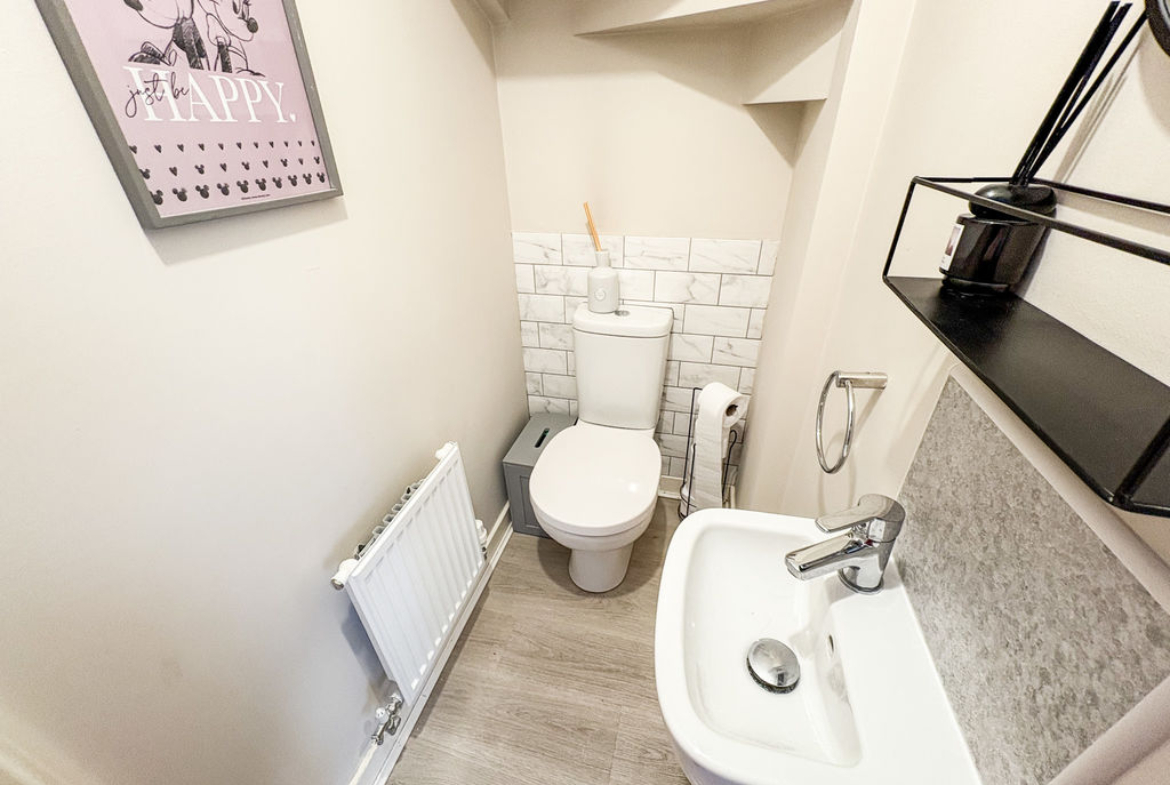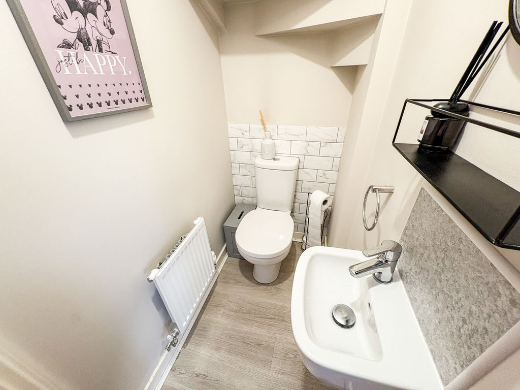 DOWNSTAIRS CLOAKS/W.C.: low level WC, hand basin, part tiling to walls and single radiator.
