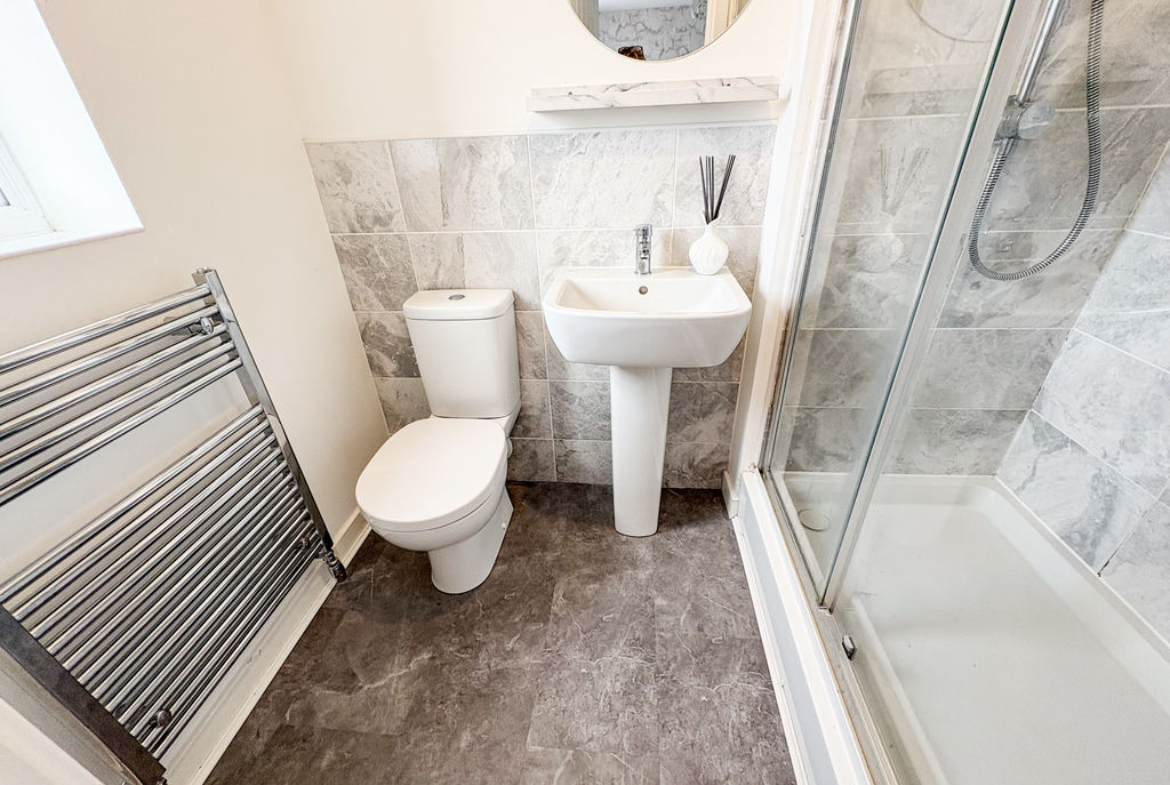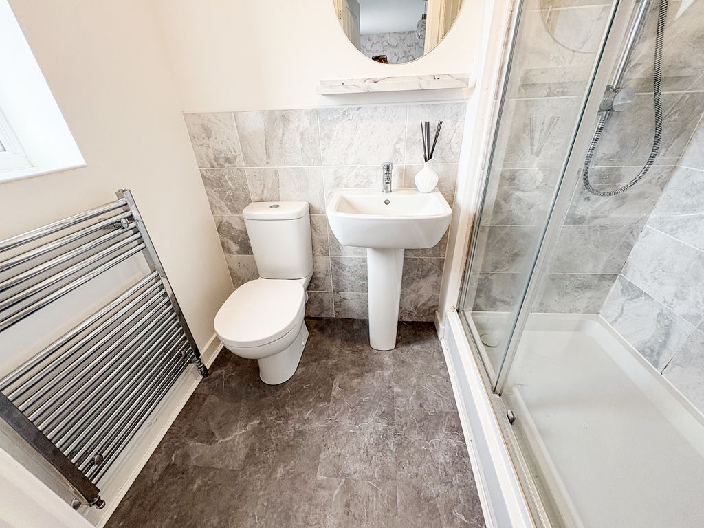 EN-SUITE SHOWER ROOM: double glazed window to front, low level WC, hand basin, shower cubicle, part tiling to walls and heated towel rail.